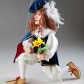 He stands 16 inches tall. Materials used for this puppet are mainly wood, resin, and fabric. His hand-painted face has a kind and gentle expression. Prince Damian is probably always in love and the sunflower that he’s holding could be just for you! He’s a real gentleman, who will bring a light and fairytale atmosphere into your home!