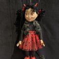 "Elle est diabolique!" Ça dit tout! Doux, effronté et très intelligente. Notre fille du diable aime bien s'habiller. Elle porte un haut à manches longues noir avec des paillettes, un pantalon de même couleur, une jupe rouge et des rubans de couleur assortie dans ses cheveux tressés. Remarquez ses jolies cornes rouges qui sortent de ses cheveux et la chaîne qu’elle tient dans sa main droite. Cette diablesse est toujours de bonne humeur. Elle voudra peut-être te taquiner une fois de temps en temps, mais à part ça, c'est un véritable petit ange :). Son corps est taillé à la main dans du bois et ses vêtements sont soigneusement cousus à la main. Cette marionnette comprend un appareil de marionnette professionnel.