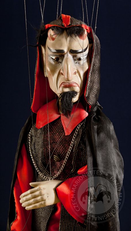 Nádherná loutka čerta, která je jediná svého druhu, našla svou cestu do naší sbírky. Jsme nadšeni, že Vám můžeme představit tento kus historie, který je kvalitně zpracován a uchoval se ve skvělém stavu. Povšimněte si čertova kovového řetězu a detailů na jeho kápi, která je z nádherné látky. Jeho propracovaný obličej mu dodává magický a tajuplný nádech.