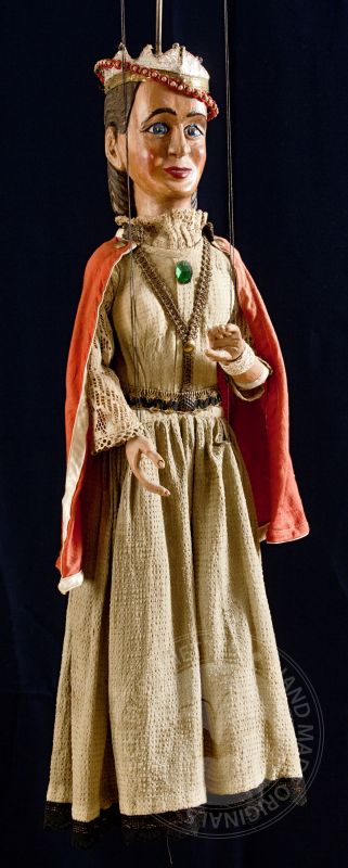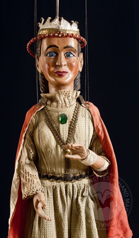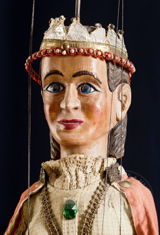 Originální starožitná loutka královny vytvořená v letech 1870-1880 loutkářem Josefem Allesy.