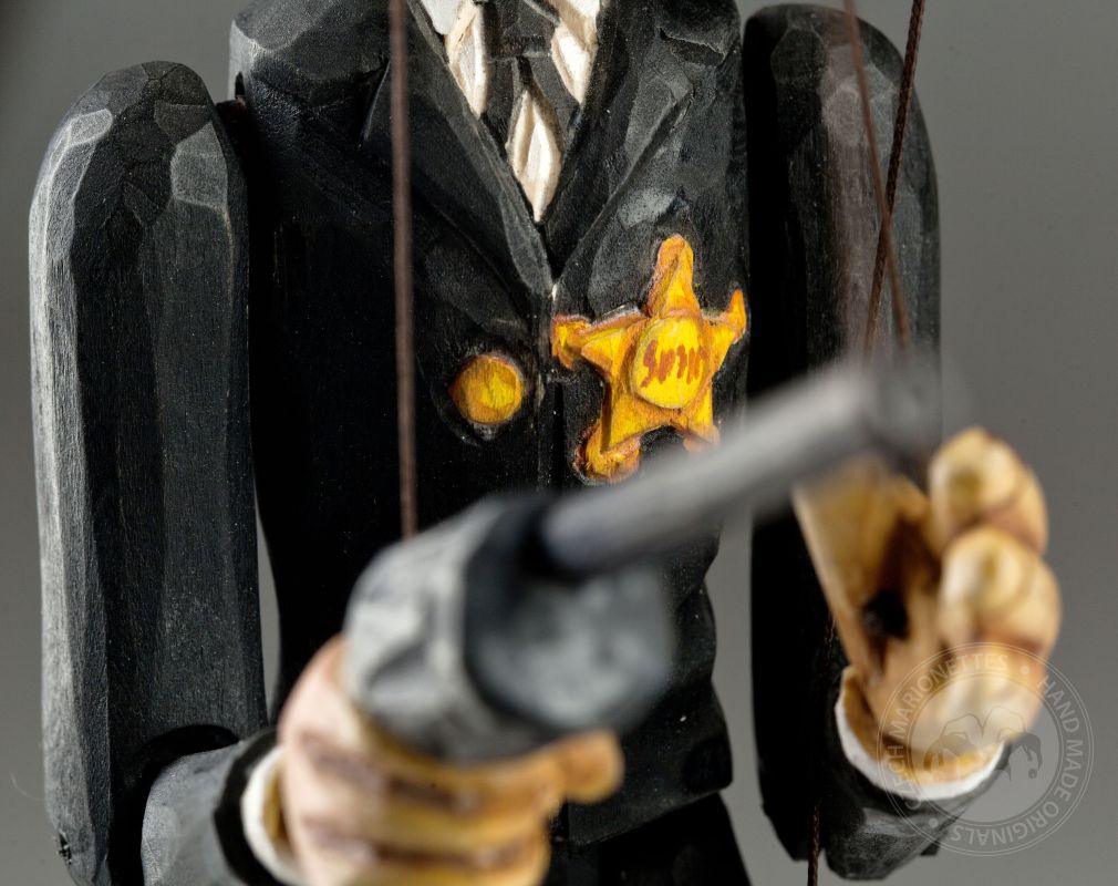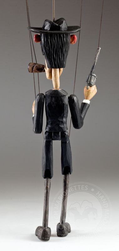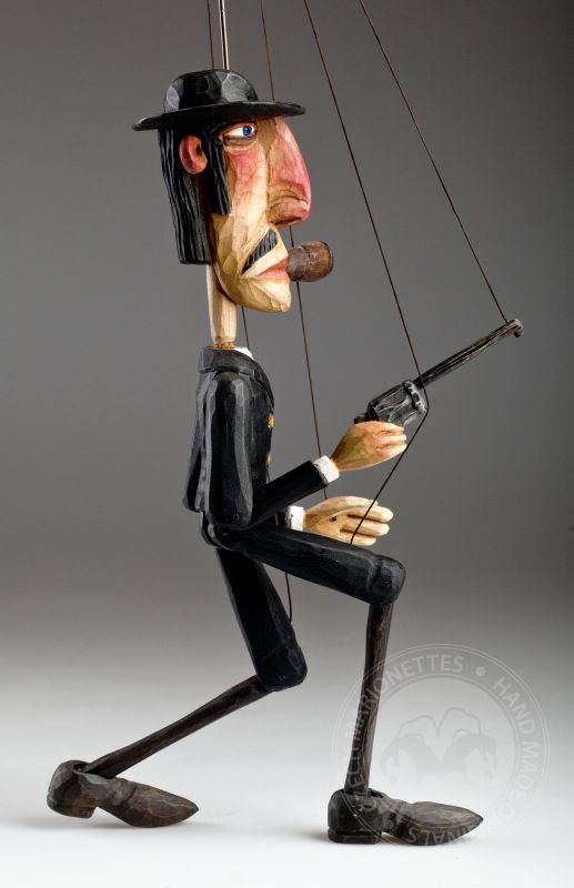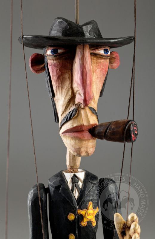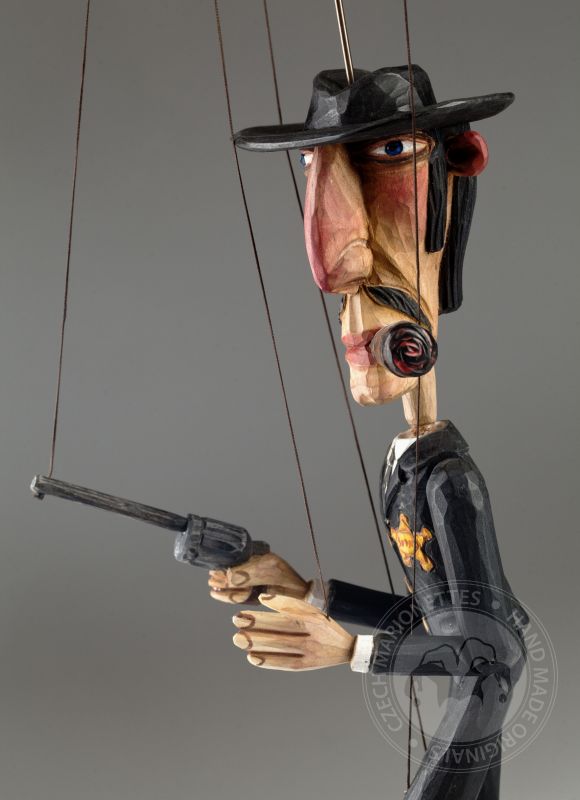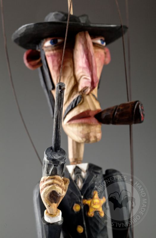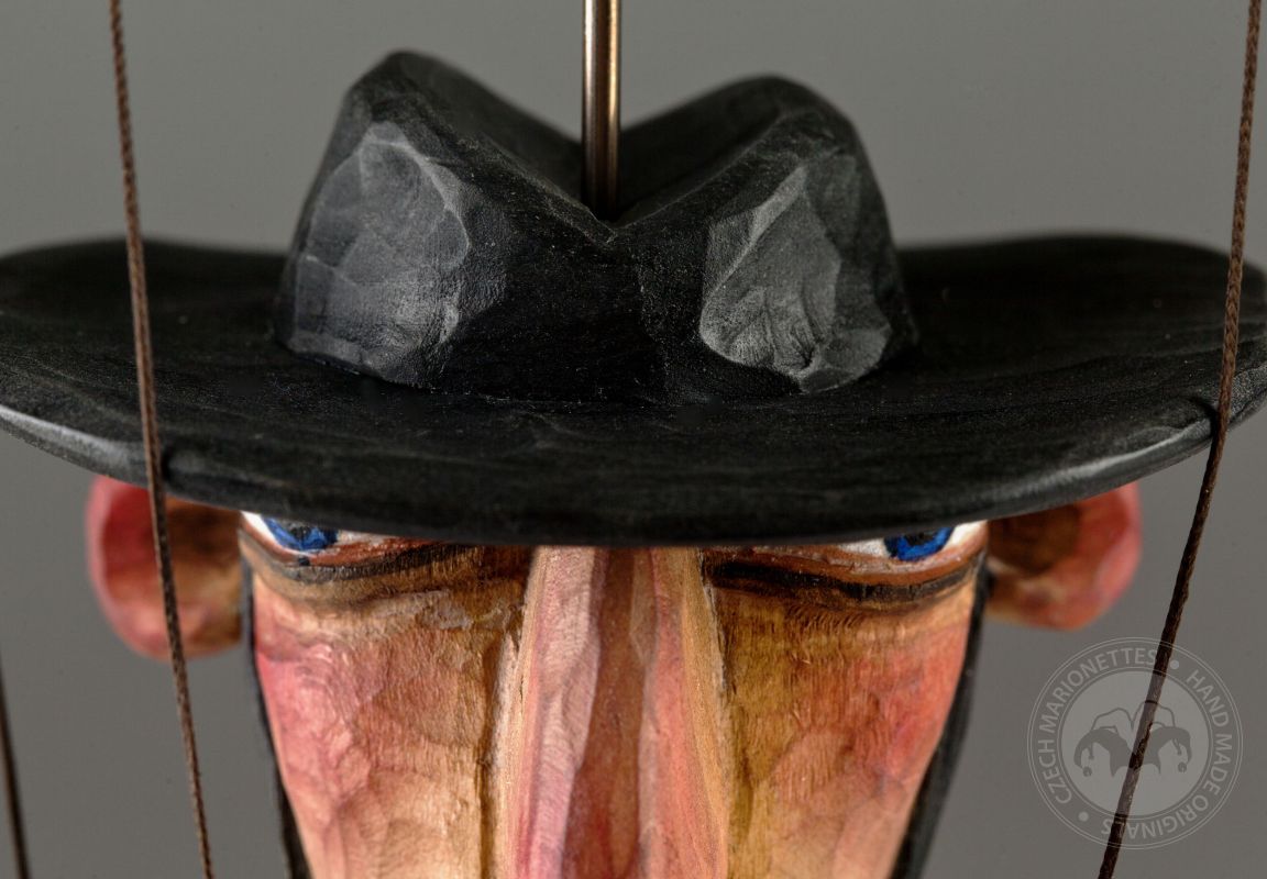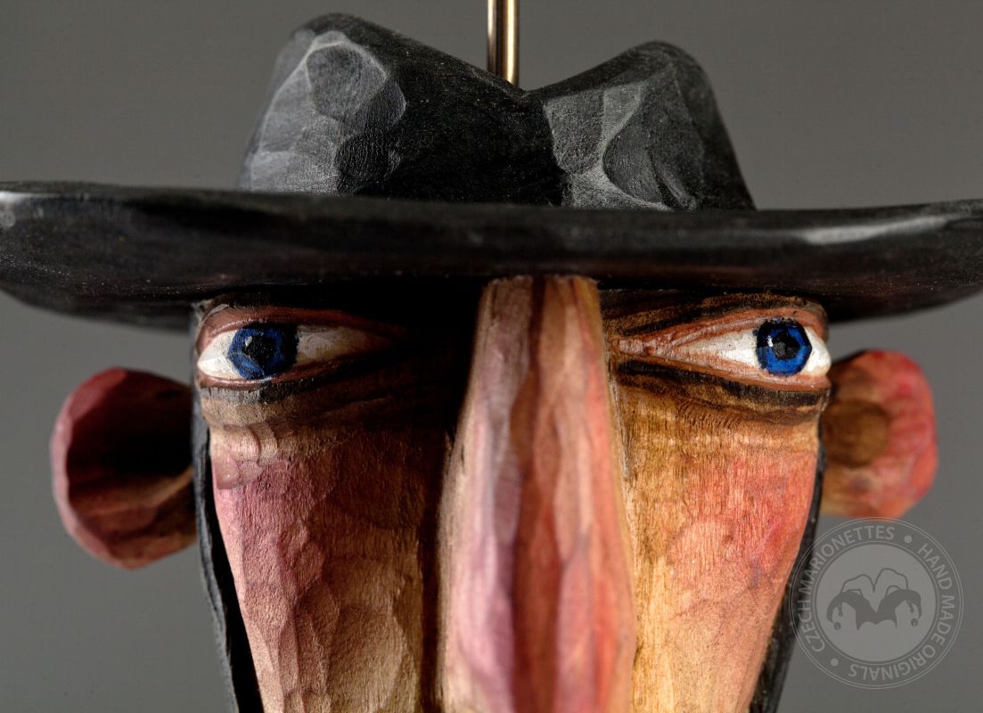 Výrazné tahy dláta, ostré rysy v šerifově výrazu. Originální loutka z rukou precizního řezbáře z loutkářské rodiny - Jana Růžičky.