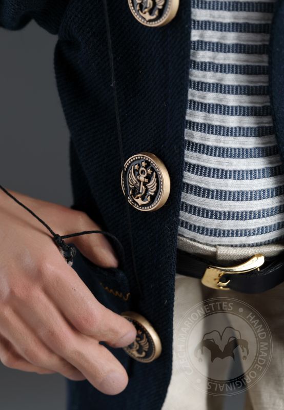 Mořský vlk má perfektně střižený kabát se zlatými knoflíky, klasické námořnické tričko a jeho obličej je ručně malovaný zdravotně nezávadnými barvami. Jako třešnička na dortu je jeho pečlivě opečový knír a milý úsměv k tomu!