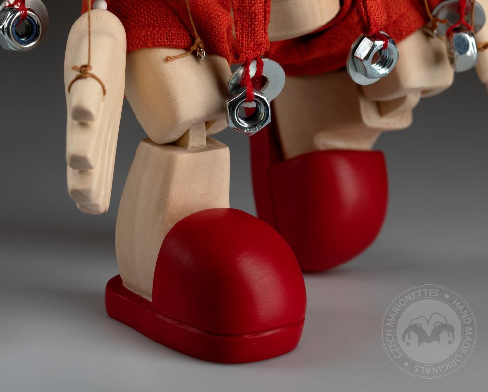 Objevte znovu kouzlo tradičních hraček s touto ručně vyrobenou dřevěnou marionetou, Šroubka Ferdy. Loutka je vyrobena z kvalitního lipového dřeva a měří přibližně 30 cm. Je vybavena pohyblivými klouby a jasně červenými akcenty. Oblečení a veselé rysy obličeje jsou pečlivě ručně malované a vyrobené, což dodává unikátní a řemeslný nádech. Loutka je oblečená do zářivě červené čepice s matičkami místo rolniček, supr kalhot a skvěle padnoucích bot. Šroubek Ferda je perfektní pro loutková představení, může být krásnou retro dekorací interiéru nebo jako unikátní dárek. Tato marioneta kombinuje klasické řemeslné zpracování s nádechem loutkářského umění a my věříme, že bude ceněna po mnoho let.