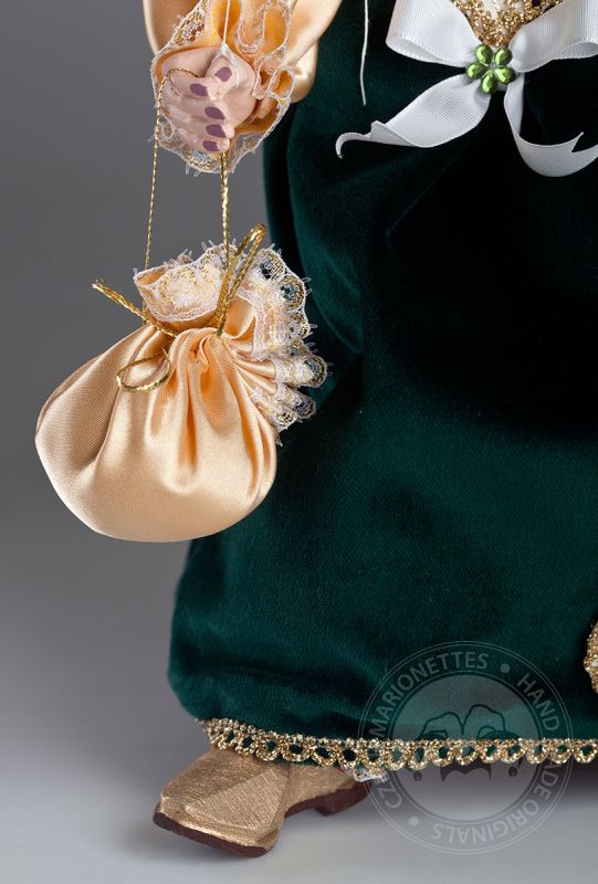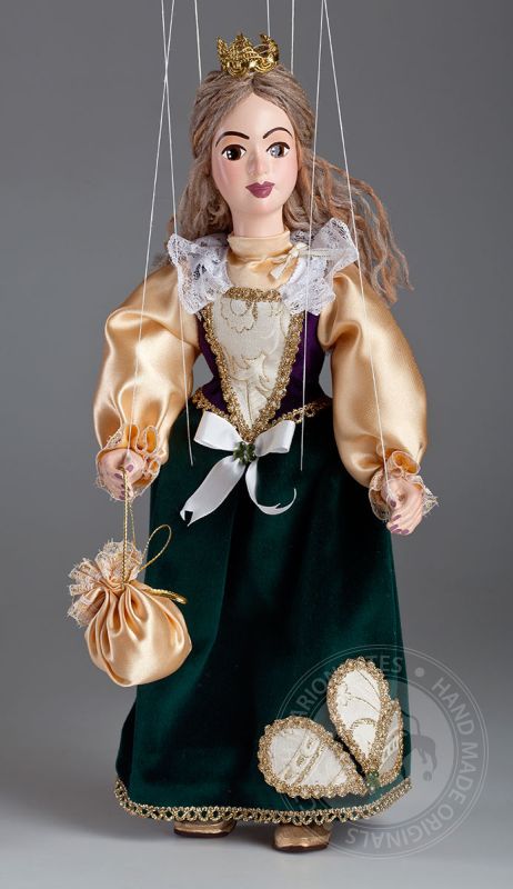 Princezna Jana je skvělá loutka vhodná pro každou generaci. Povšiměte si úžasných detailů na jejích šatech. Zlatá výšivka, krajkový límeček a kombinace světle filkové a sytě zelené barvy, krásně ladí s jejími vlnitými vlásky a usměvavýma hnědýma očima. Co naší princeznu dělá ještě roztomilejší,je žabka, sedící na její pravé ruce a zlatá korunka, která jí dodává královský vzhled.