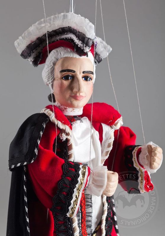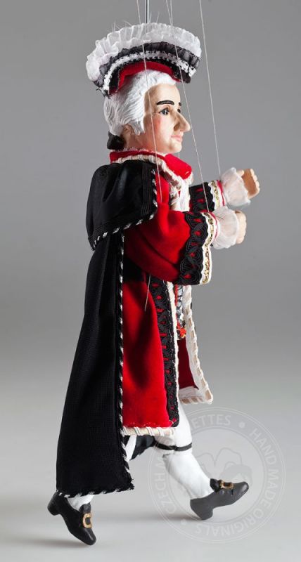 A právě jste ho nachytali jeho dvou nejoblíbenějších činností – hraní na klavír a nakažlivý smích. Loutky jako tento Amadeus jsou vyráběné v limitovaných edicích po pár kouscích. Hlava, ruce a nožičky jsou odlévané a ručně malované, tělíčko (kostra) je z lipového dřeva. Loutka má tradiční ovládání, s vahadlem je spojena pevným drátem a k ovládání rukou a nohou jsou použité klasické nitě.