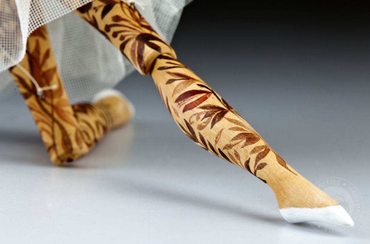 Ballerinas haben immer etwas Besonderes. Sie sind alle so schön und schön. Diese ist noch einzigartiger wegen der Blumenornamente, die überall auf ihrem Holzkörper handbemalt sind. Die ganze Marionette ist in erdig warmen Brauntönen gehalten. Ihr typischer weißer Rock und ihre Ballettschuhe bilden einen großen Kontrast zur Hautfarbe.