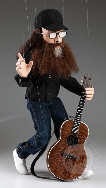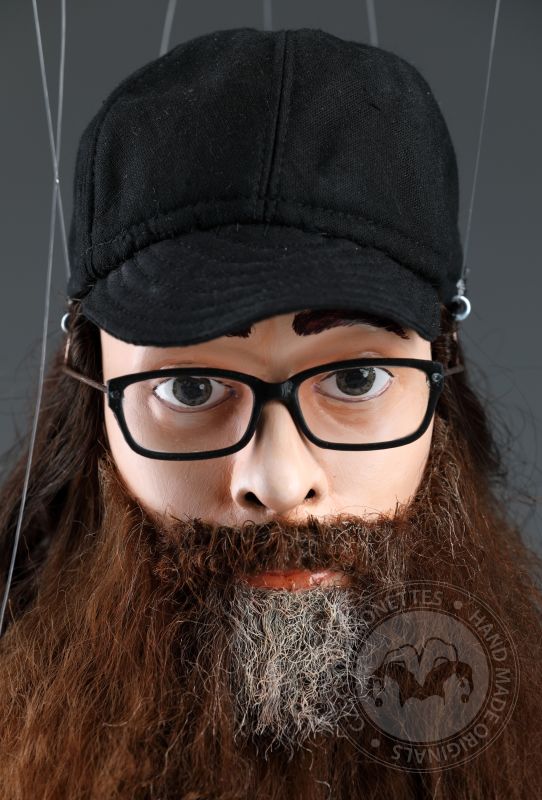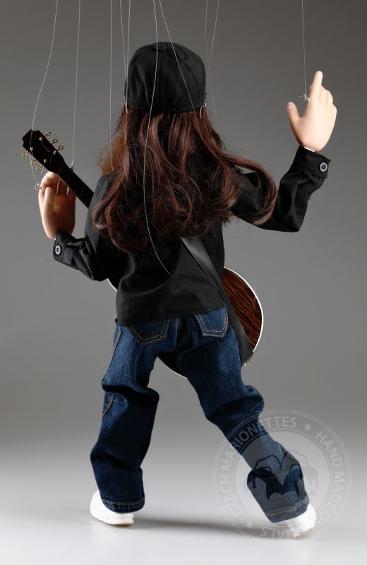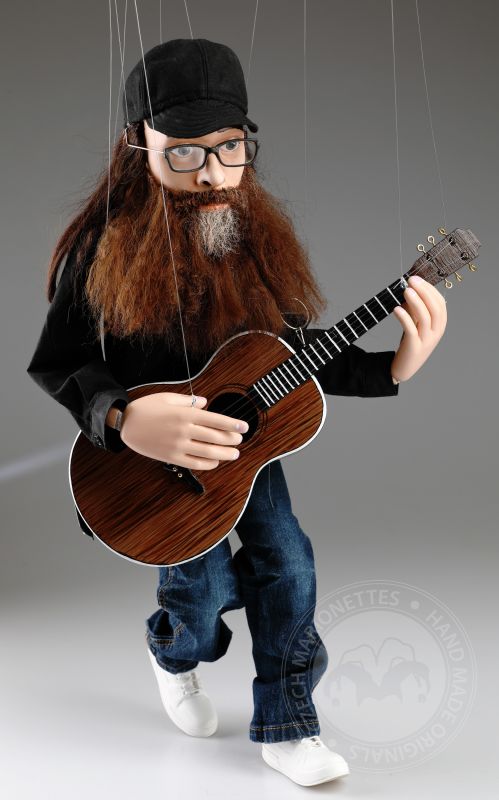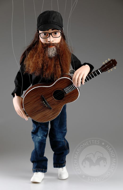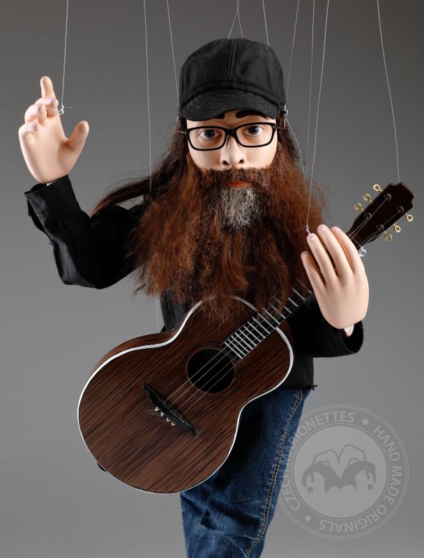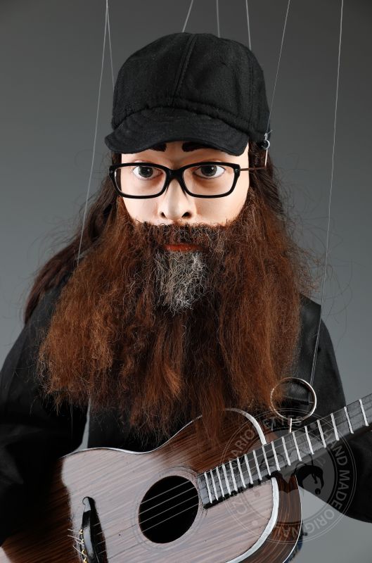 Every new marionette we make is special. So is this handsome guitar player marionette made based on a photo. A handmade custom puppet with great accessories and an acoustic guitar.