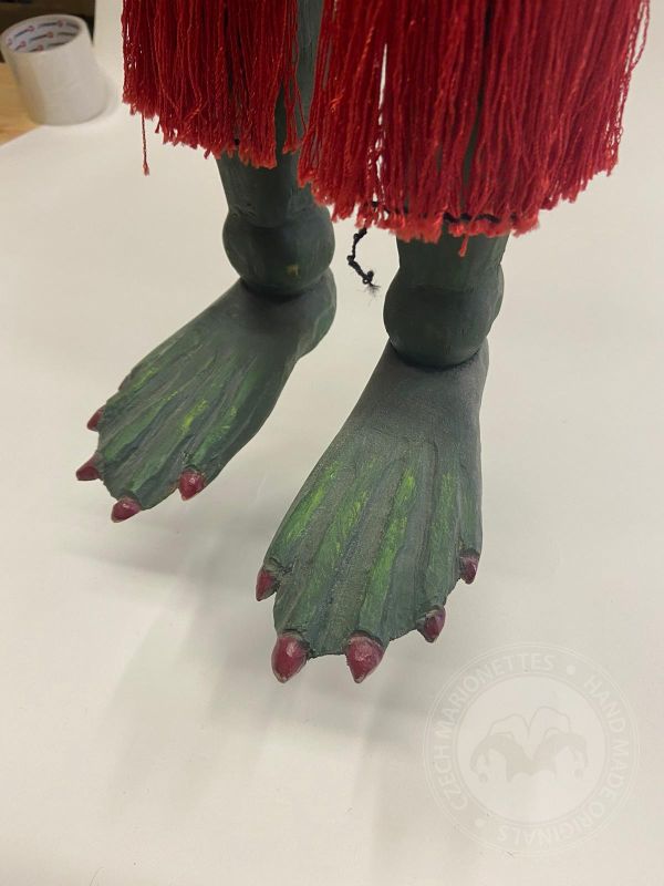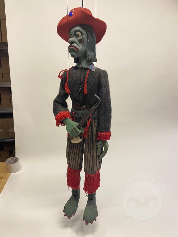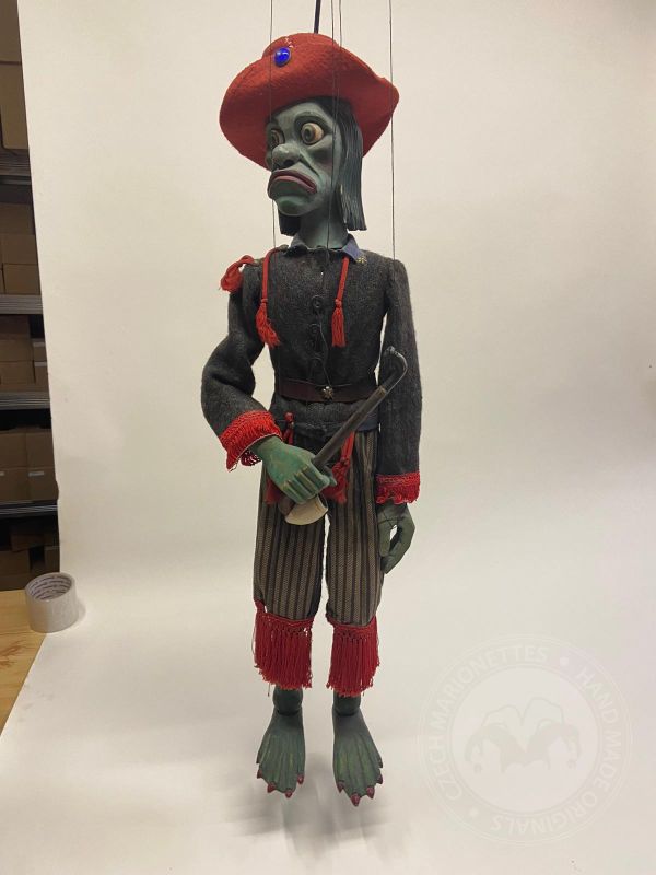 This beautiful marionette has a lot of details that you can't miss. One of them is a beautiful, hand-carved pipe that he holds in a clenched fist. Another thing you need to pay attention to is his legs with webs for swimming and little red claws. His hair and all the details of his face are also hand-carved and painted. His clothes have a lot of studs, buttons and pieces of fringe, and his leather belt with a decorative fastening is also not to be overlooked. His hat has a decorative blue rhinestone in the middle. All these fabrics are original, the marionette is carved from linden wood. In short, a unique work of art.