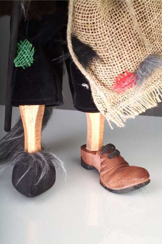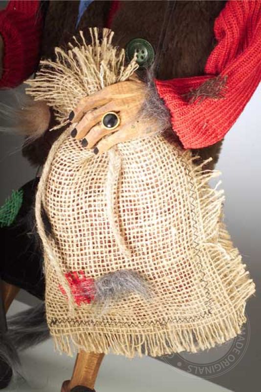 Su cuerpo está tallado a mano en madera, la cabeza y las manos están hechas de resina y su ropa y accesorios son hechos a mano.