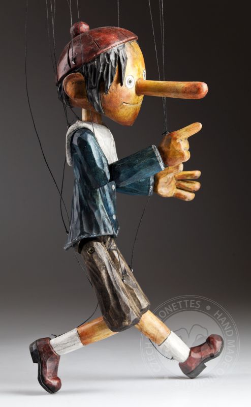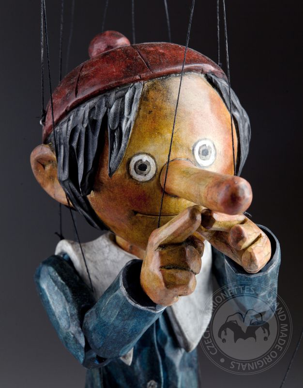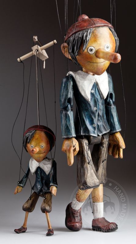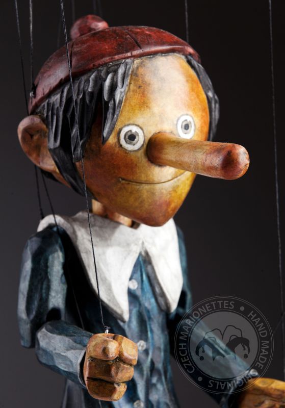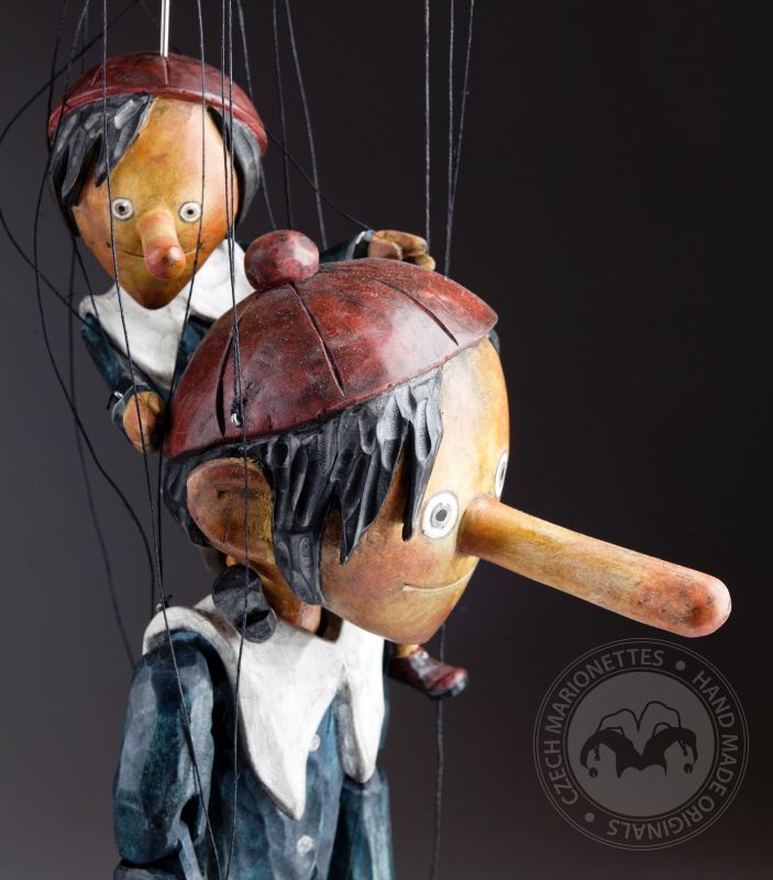 El conocido personaje de Pinocho llega en un tamaño grande. Esta es una impresionante marioneta tallada a mano que lleva el estilo característico del artista Martin Růžička.