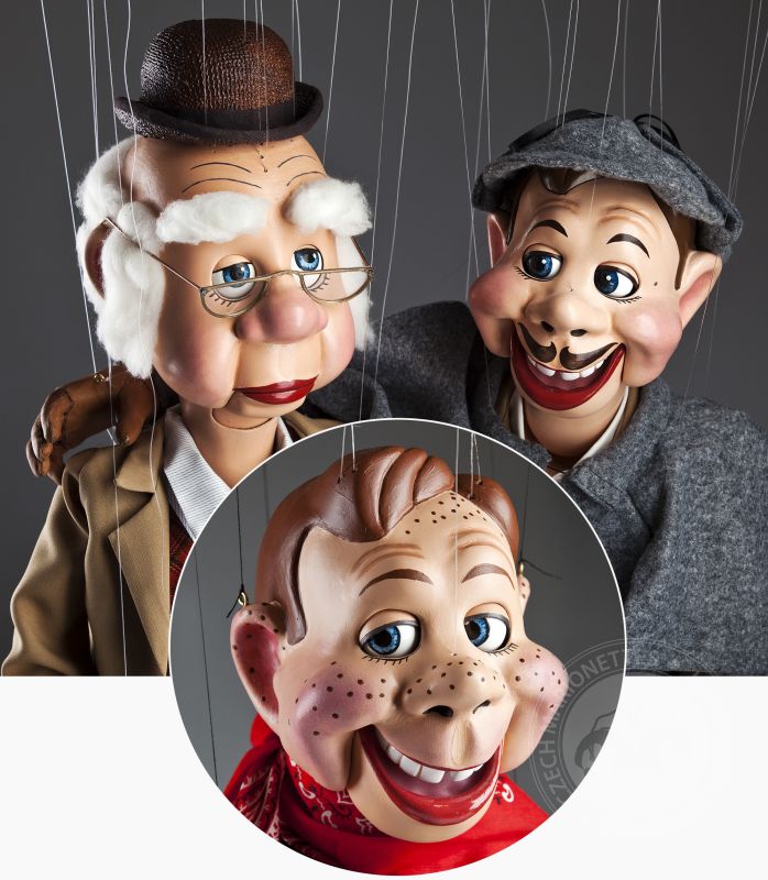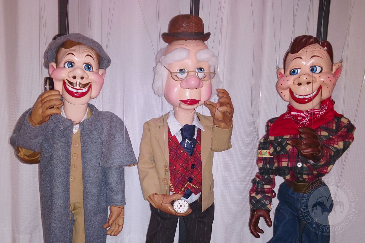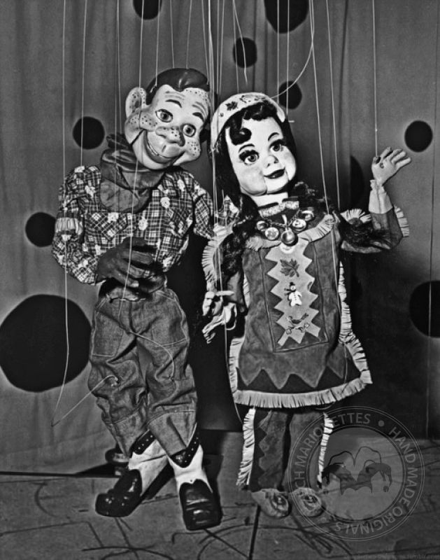 Howdy Doody y sus amigos son conocidos títeres de un programa de televisión estadounidense de finales de los años 1940 y 1950. Nuestras réplicas de estos populares personajes están hechas a mano por encargo. Tienen ojos y boca móviles, y el rango de movimiento puede ser mejor que el de los originales gracias a un conocimiento más avanzado de la mecánica.