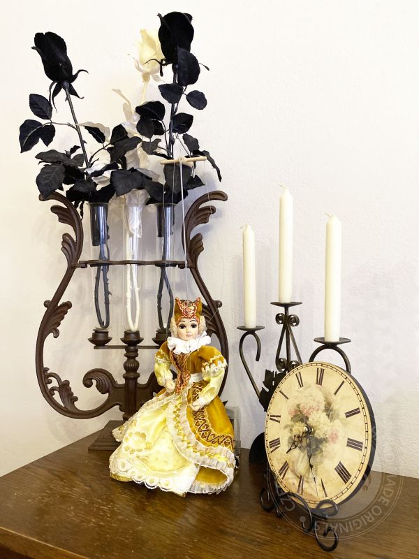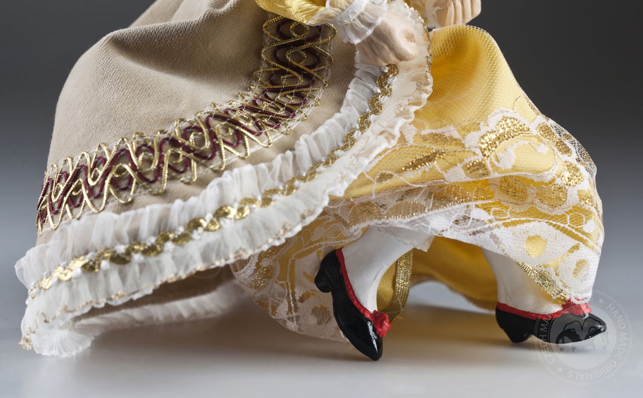 La mágica marioneta de hilo con vestidos ricamente decorados, casi barrocos, deleita la vista y te hace feliz. Mira los hermosos detalles del vestido y el sombrero. ¡En las fotos podéis ver lo bonitos que lucen en el interior los títeres de esta colección!
