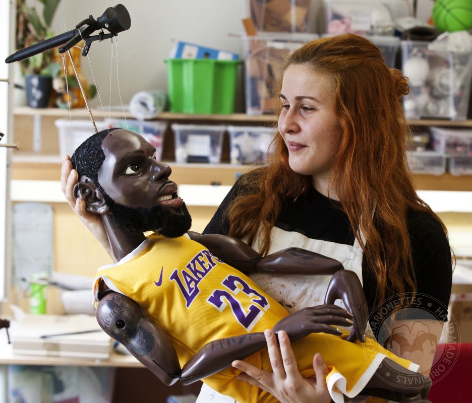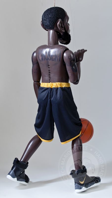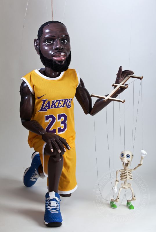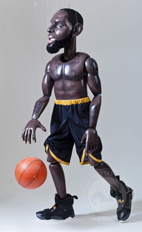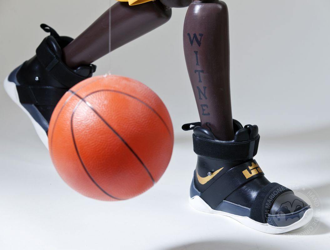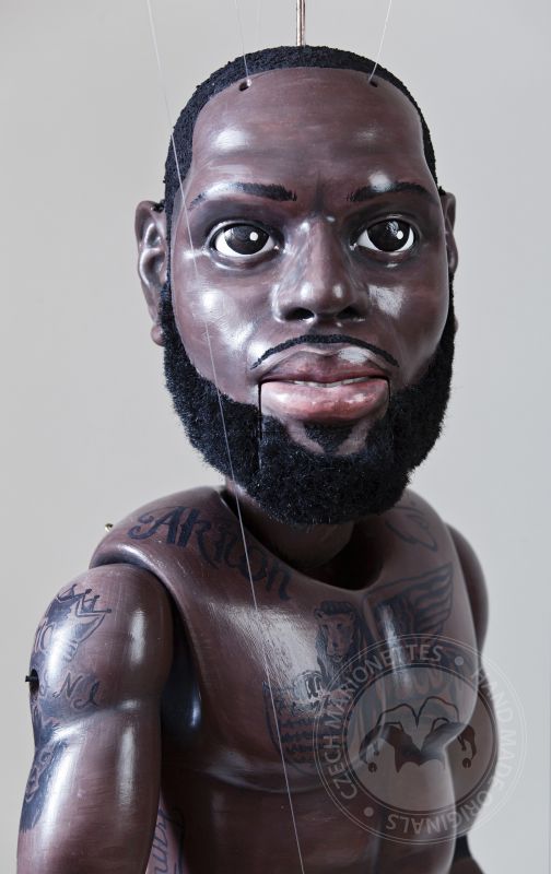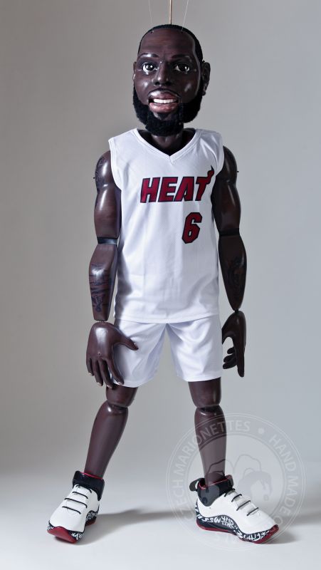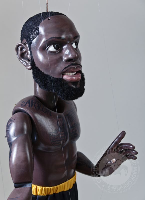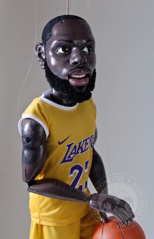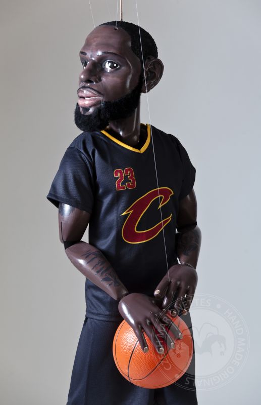 Puede mover los ojos de un lado a otro y abrir la boca, lo que lo hace muy realista. Su típica barba y peinado son el toque final. La marioneta de LeBron James tiene tres atuendos diferentes y zapatillas, todas réplicas perfectas de su vestimenta real. Cada traje está cosido a mano con telas que incluyen logotipos impresos especialmente para esta marioneta, y ajustados para poder cambiarlos.