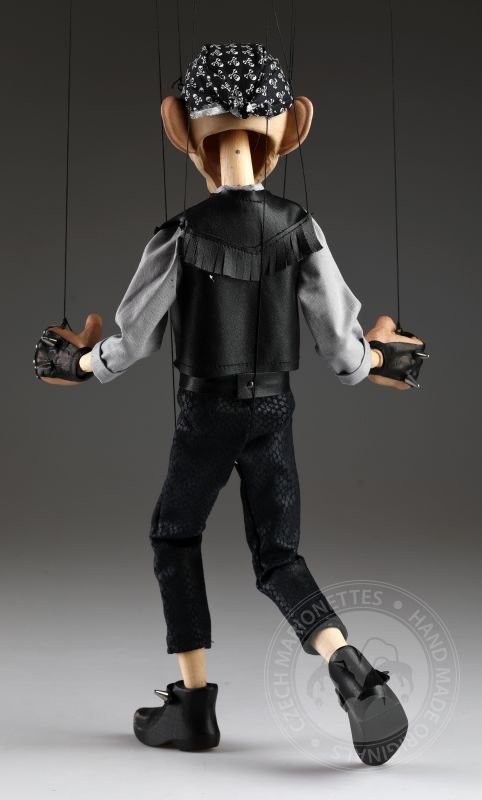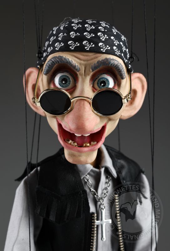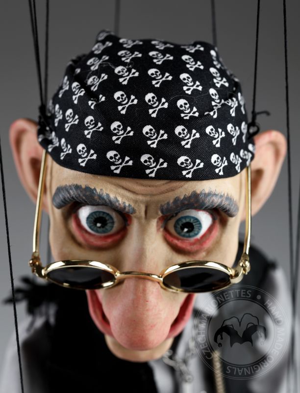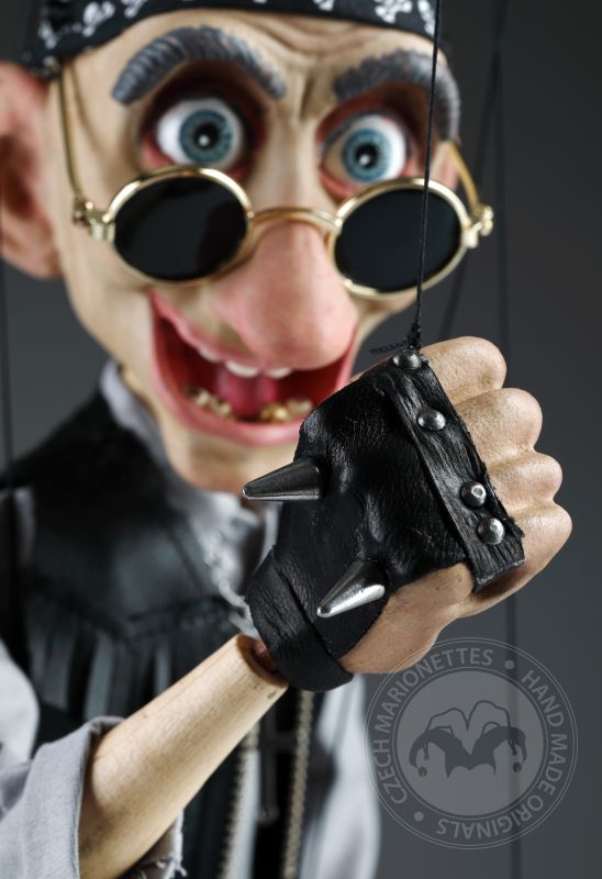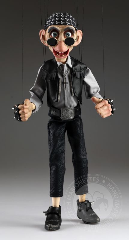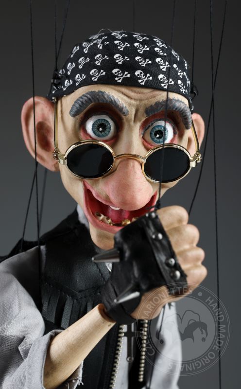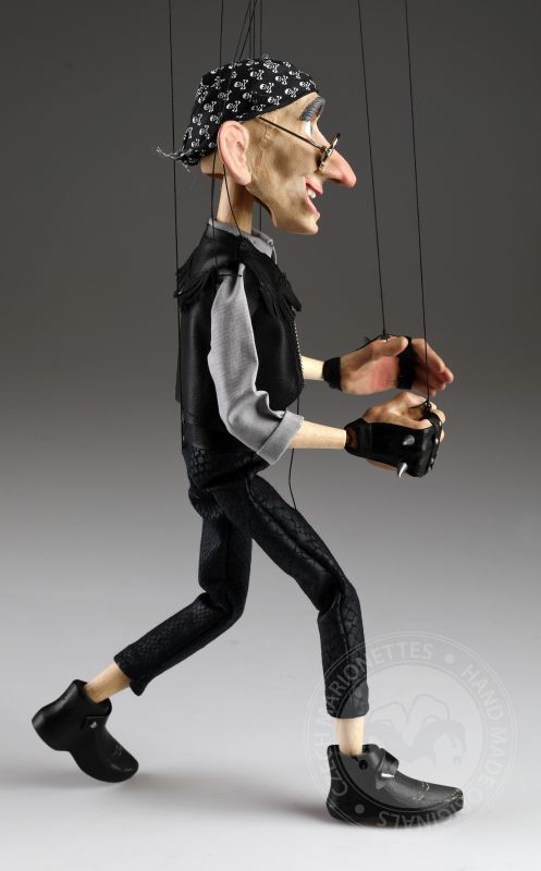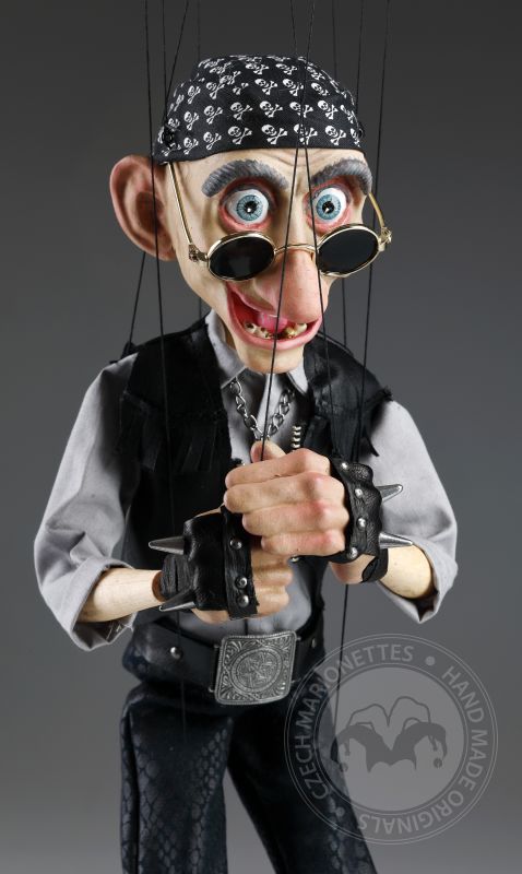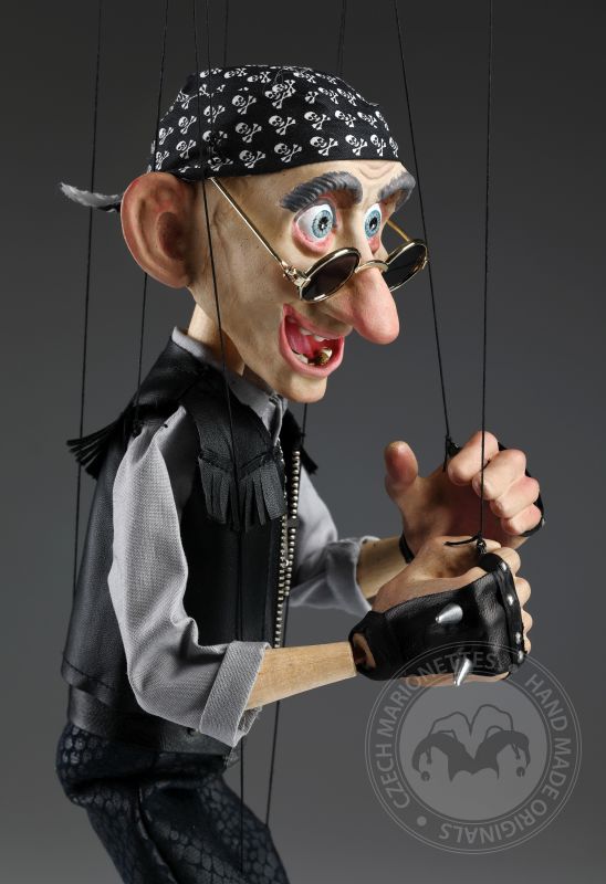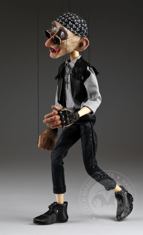 La marioneta Bob Checa es una marioneta hecha a mano con una gran actitud. Siempre está de buen humor, siempre en la carretera y hará que sonrías incluso cuando estés triste. Su cuerpo está tallado en madera de tilo, y su cabeza y manos están hechas de resina moldeada. Observa detalles como sus geniales gafas de sol, el pañuelo alrededor de la cabeza y la chaqueta de cuero. Bob trae diversión y una gran sensación a donde quiera que vaya.