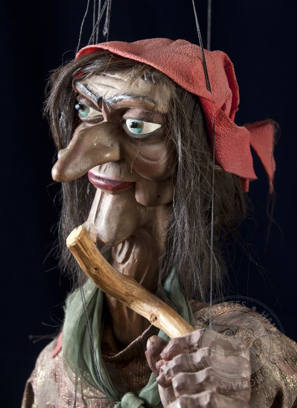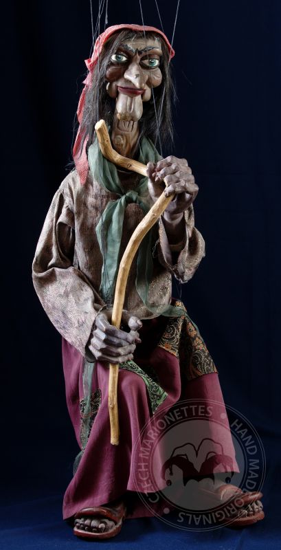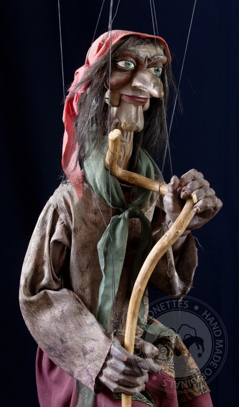 Marioneta de bruja antigua sosteniendo un palo Esta hermosa marioneta parece salida de un cuento de hadas. Su cuerpo está decorado con telas antiguas originales que sólo aumentan su mística. Nótese los detalles en forma de arrugas que son evidentes en su rostro y cuello. Incluso sus brazos y pies están pensados hasta el último detalle. Todo ello crea una marioneta completamente original de una época pasada. František Šimek František Šimek (1881-1949) aprendió el oficio de tallado de su padre. Creó cabezas y marionetas enteras solo o con otros titiriteros checos. También renovó marionetas para otros titiriteros. El vestuario fue confeccionado por su esposa. Además de marionetas, también fabricó muebles y artículos de primera necesidad y restauró esculturas de madera en iglesias.