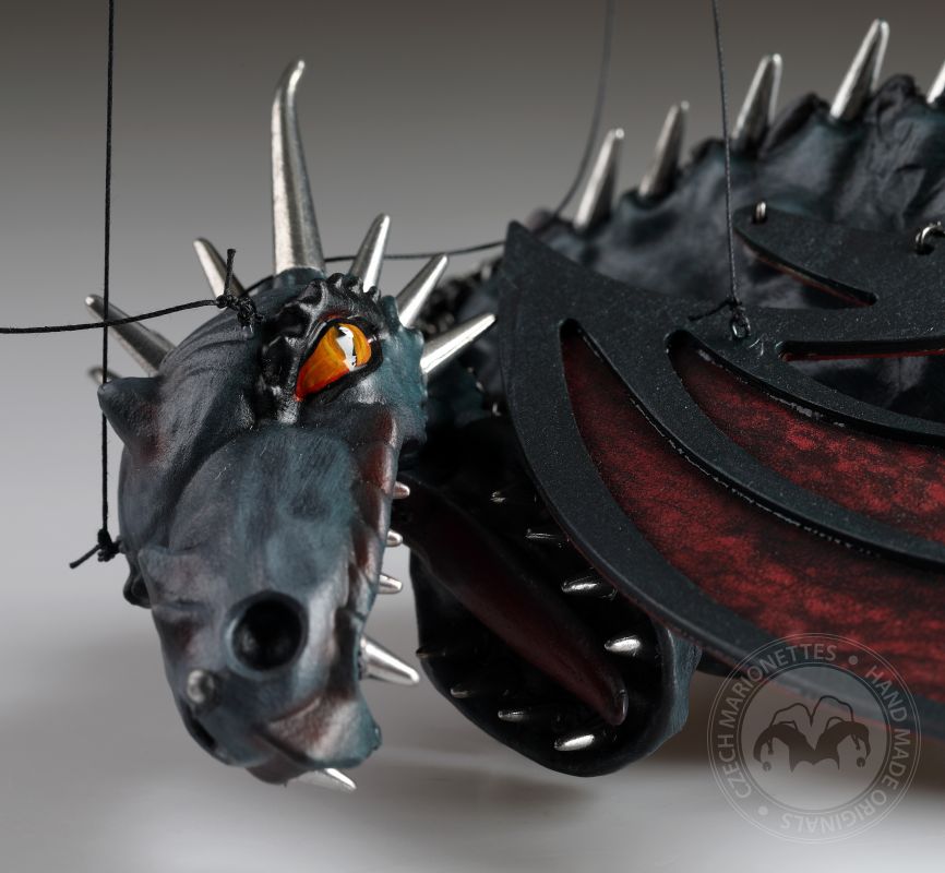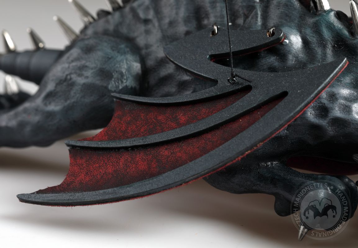 El cuerpo y la cabeza están moldeados en un material especial y duradero, complementados con hermosos detalles metálicos, como sus afiladas espinas. El cuello, que conecta la cabeza con el cuerpo, está compuesto por varias cadenas de metal, lo que permite un movimiento suave y natural, además de producir un sonido de tintineo cuando se mueve. Este detalle no solo es funcional, sino que le da al dragón un aspecto inusual y lujoso.