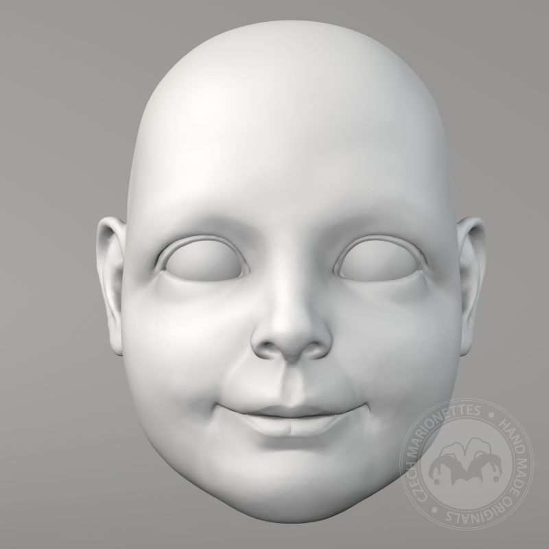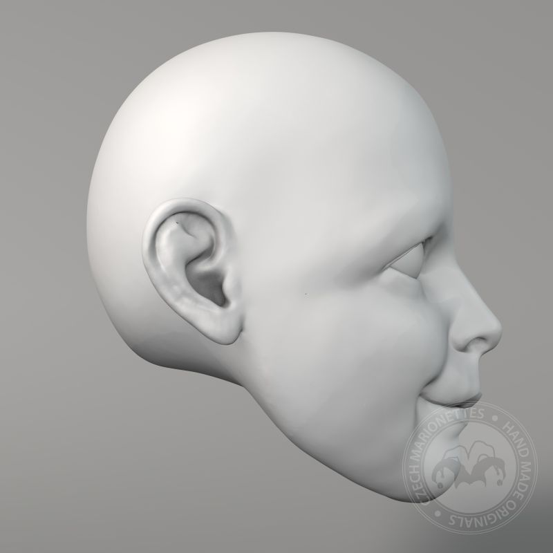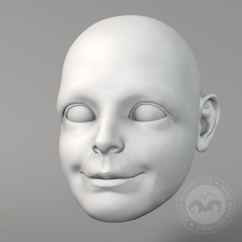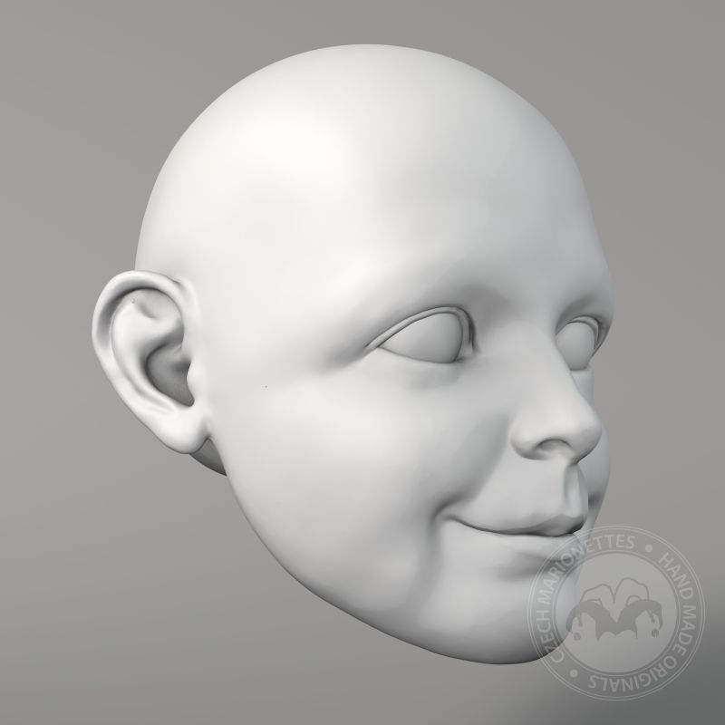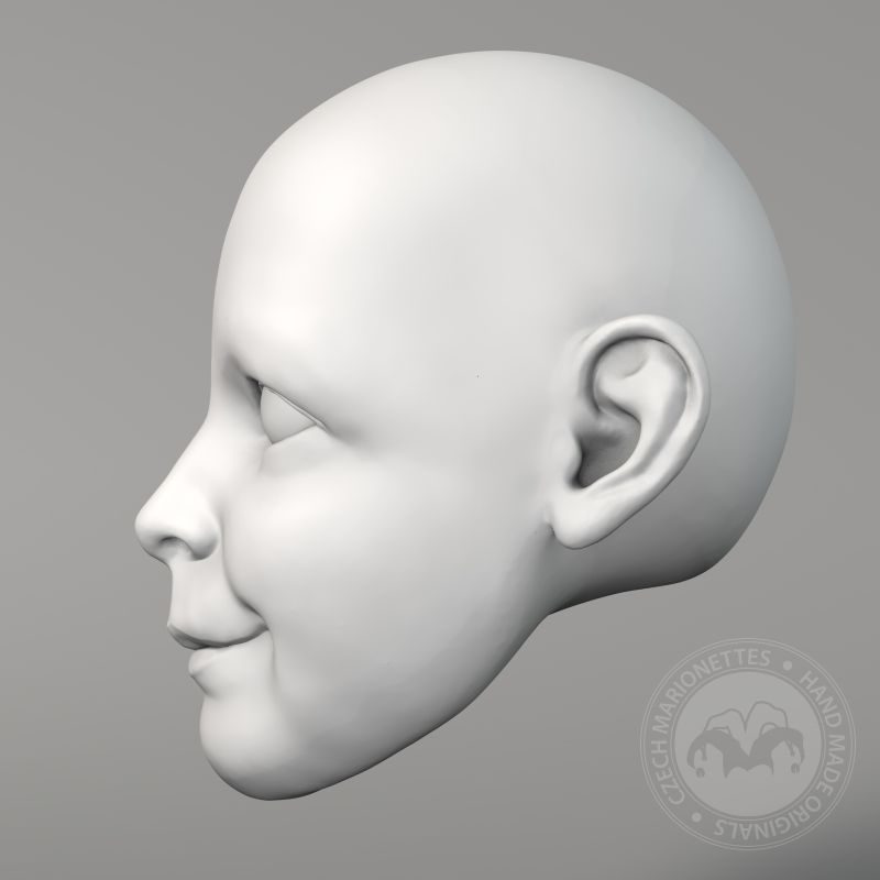 Compra y descarga un modelo en archivo stl de una linda cabecita de niña, hecho para una marioneta (títere de hilos) de 24 pulgadas/60 cm. Puedes usar este objeto 3D para cualquier propósito o puedes comprar uno de nuestros cuerpos + controladores de marionetas y construir tu propia marioneta.