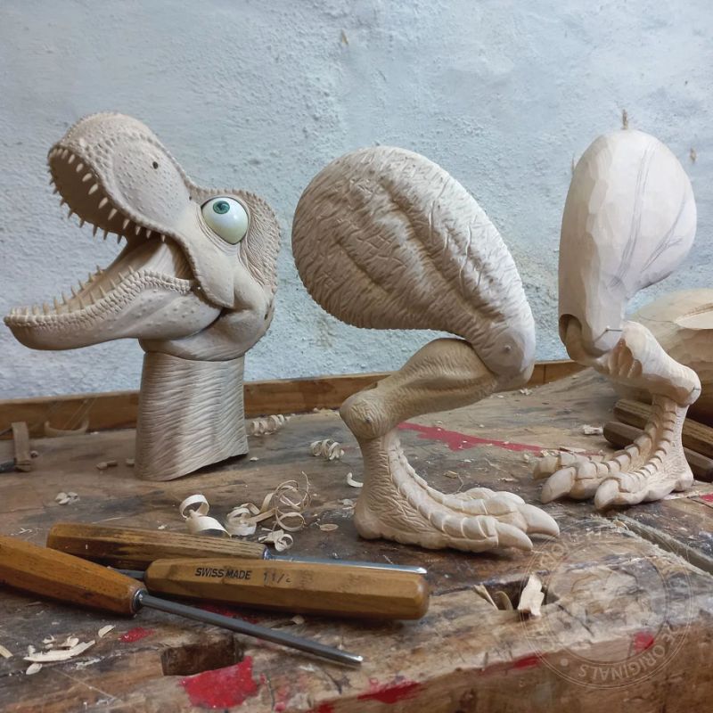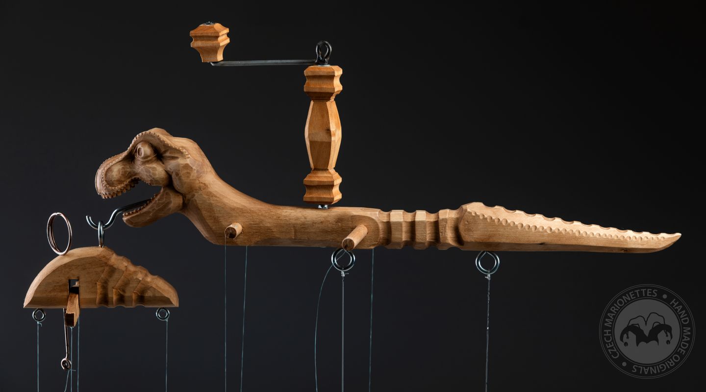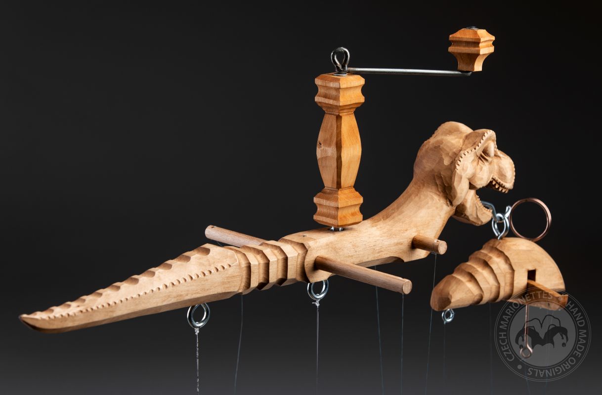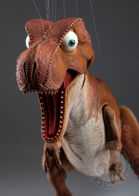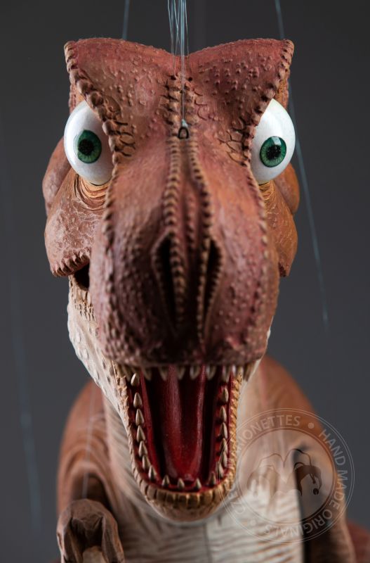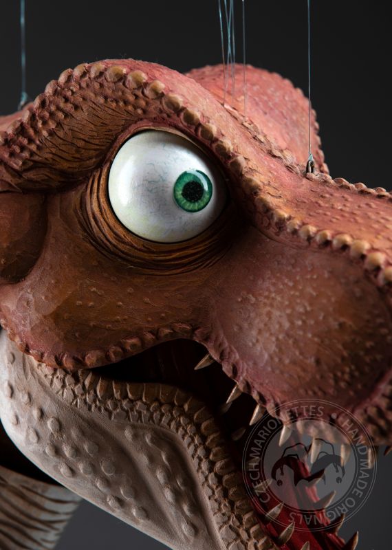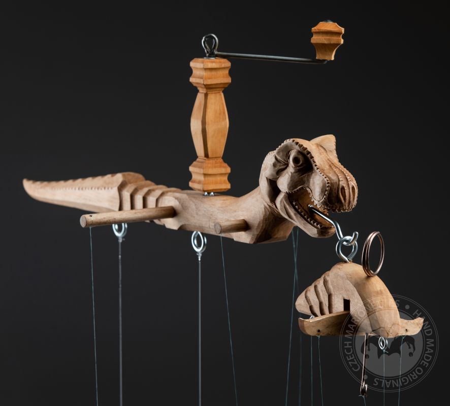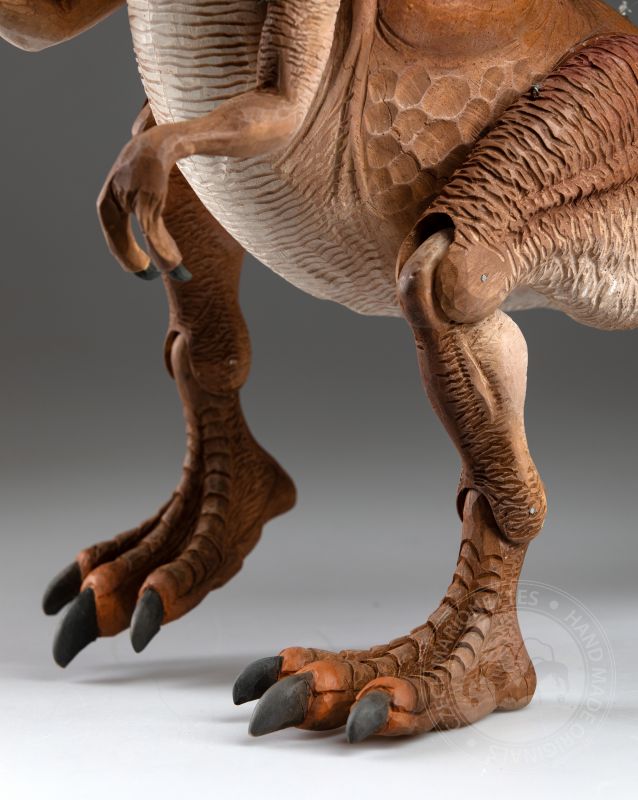 Todo el dinosaurio está tallado a mano en madera de tilo y cuidadosamente pintado a mano después. Esta marioneta tiene la capacidad de mover los ojos, abrir su boca llena de afilados dientes y girar gracias a un controlador especial, que también está decorado de manera única.