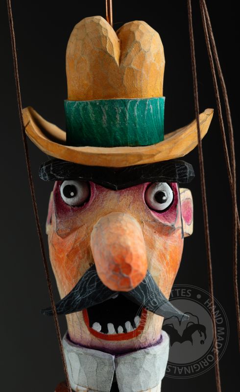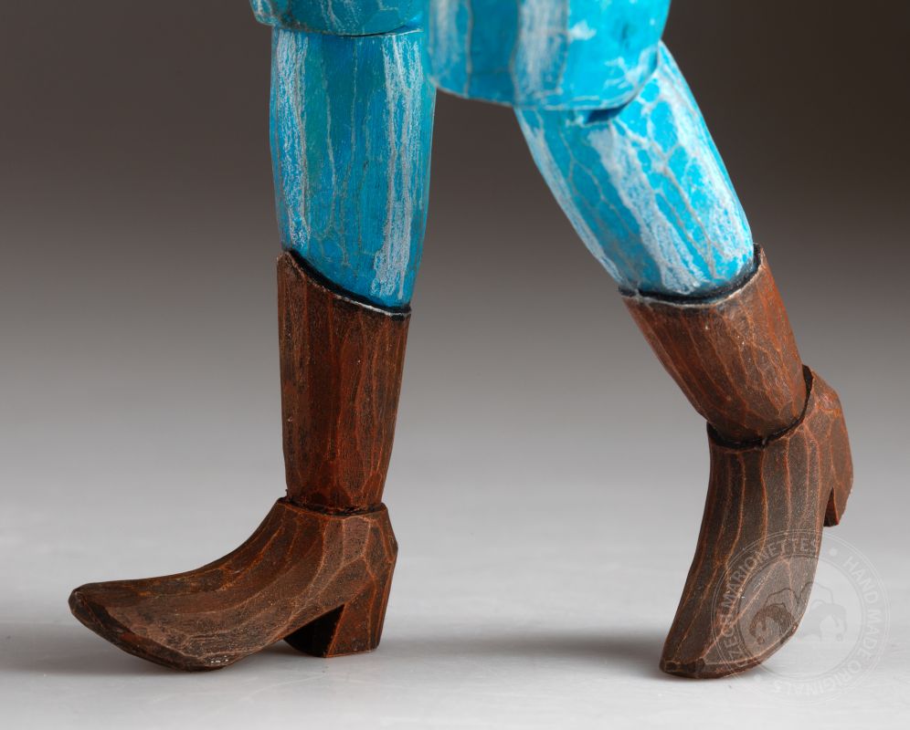 Nuestro nuevo Vaquero ha recorrido el mundo de las armas, los villanos, los caballos salvajes y los desiertos. Está hecho en un estilo muy especial. Puedes ver el arte de la talla de madera y una superficie cuidadosamente pintada. En general, esta marioneta es divertida, colorida y graciosa al mismo tiempo. Estamos completamente enamorados de él.