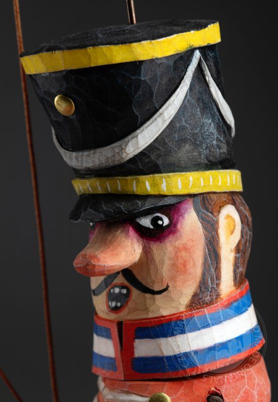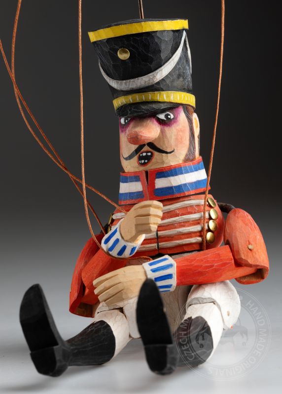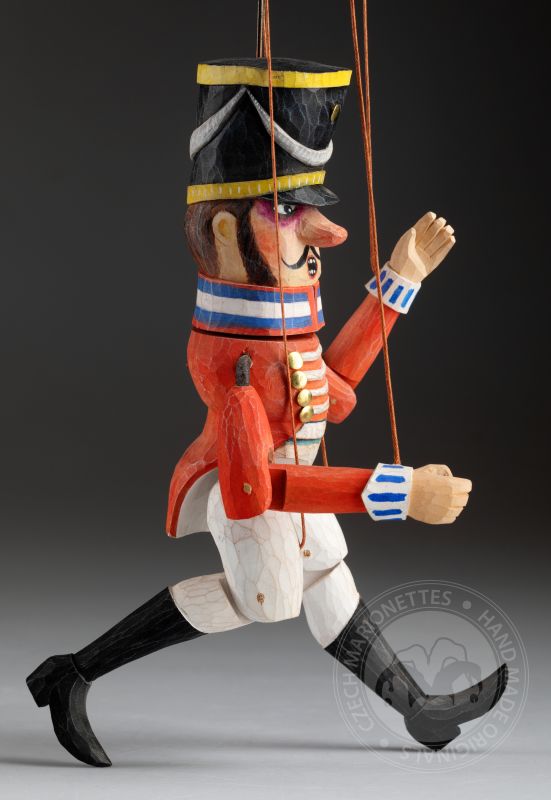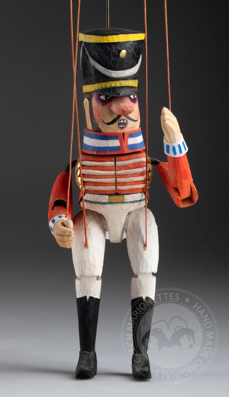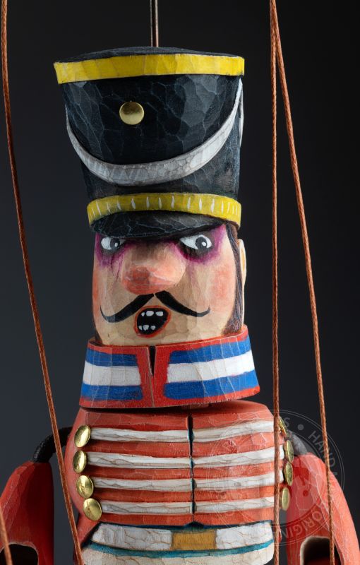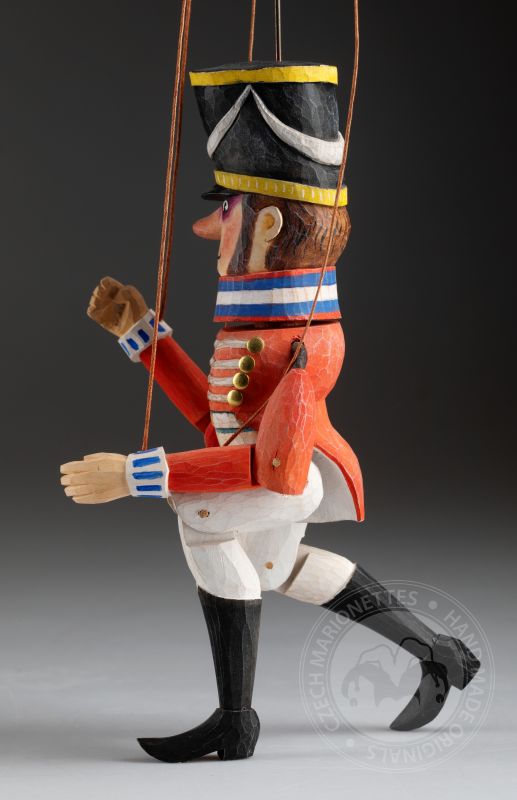 Una maravillosa versión de un soldado por Jan Suša. Es una marioneta clásica, de madera, tallada y pintada a mano.