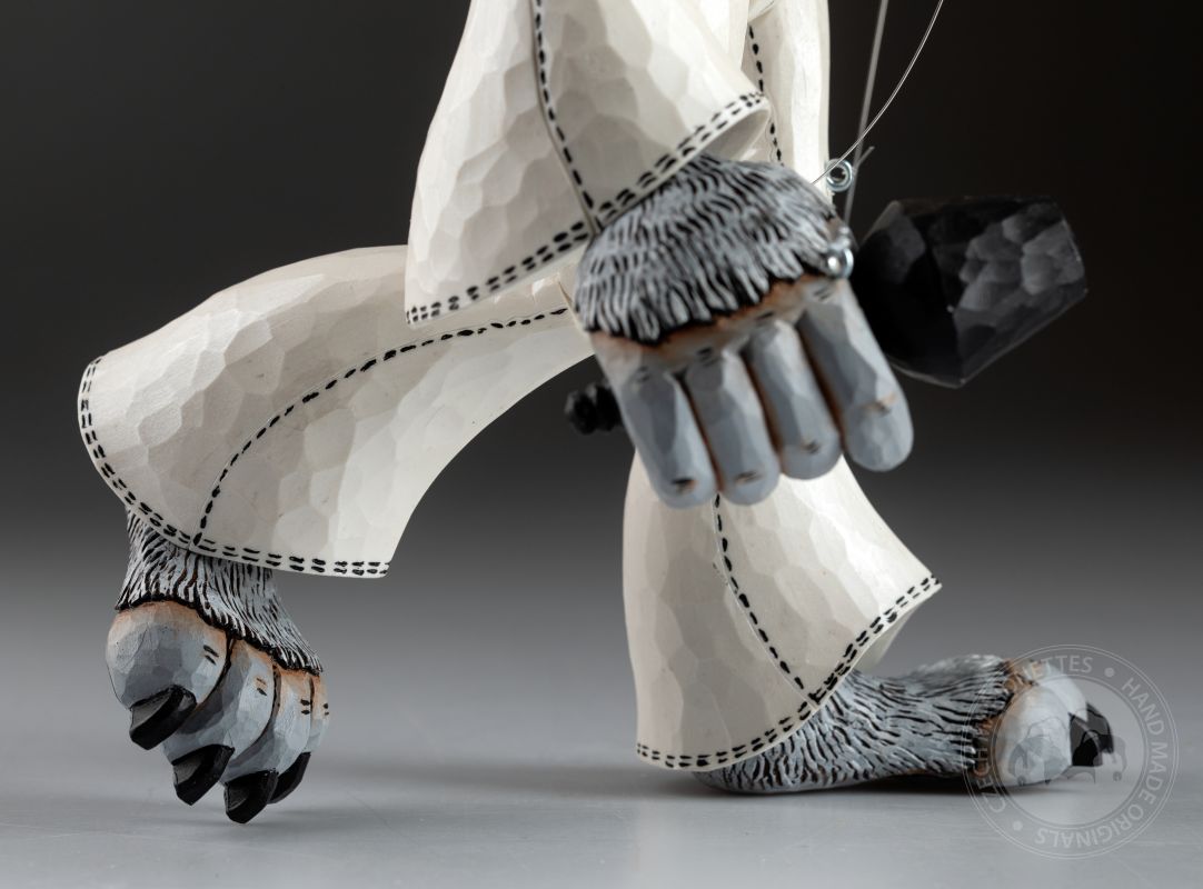 La marioneta Wolf Elvis está hecha de una pieza moldeada en resina y pintada a mano. Cada detalle ha sido cuidadosamente trabajado. Su expresión descarada y su traje glamuroso hacen de este lobo una criatura impresionante y súper cool.