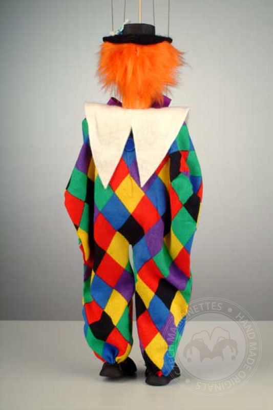 Esta colorida marioneta de payaso mide aproximadamente 8 pulgadas de alto.