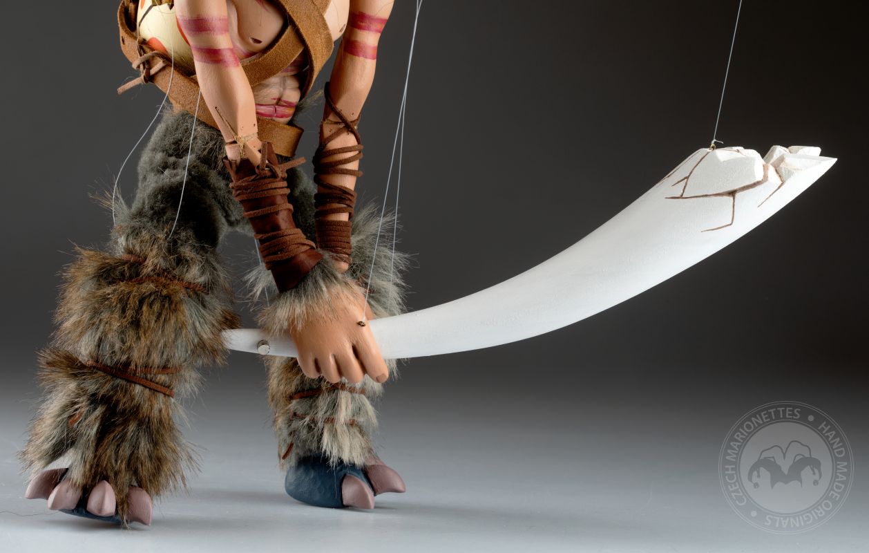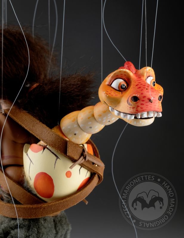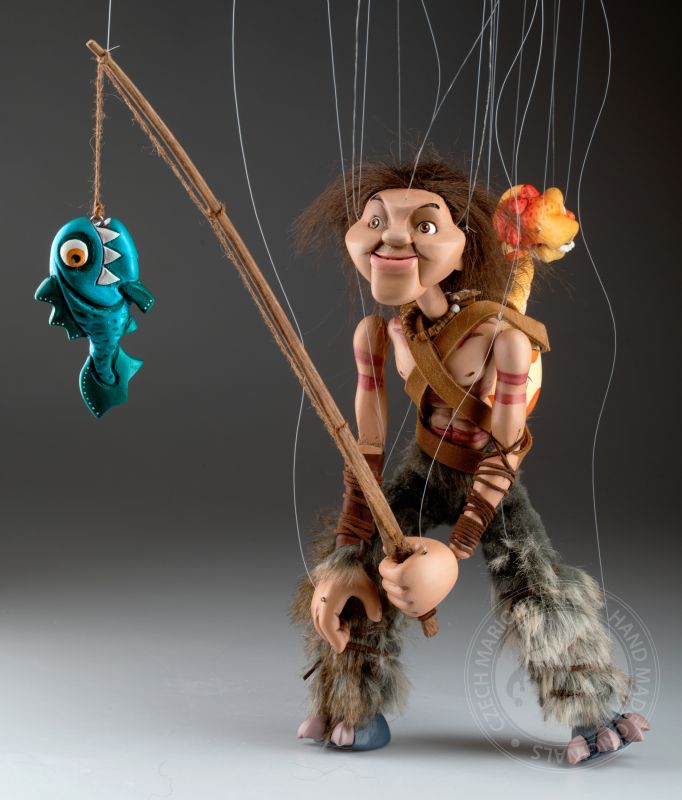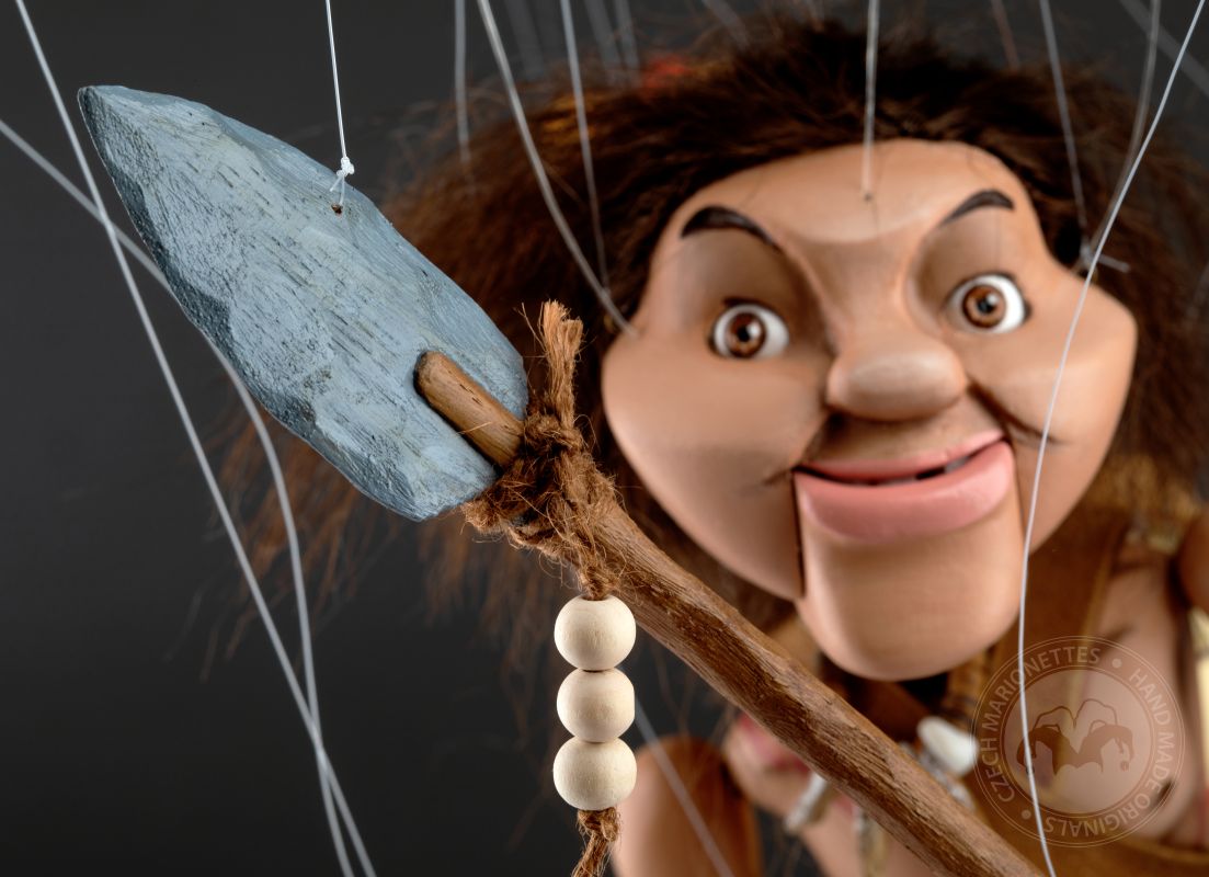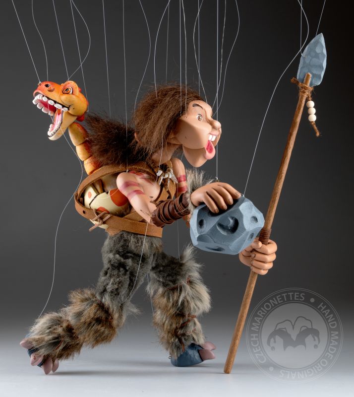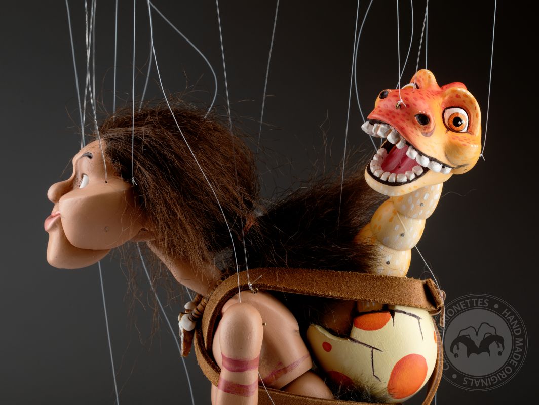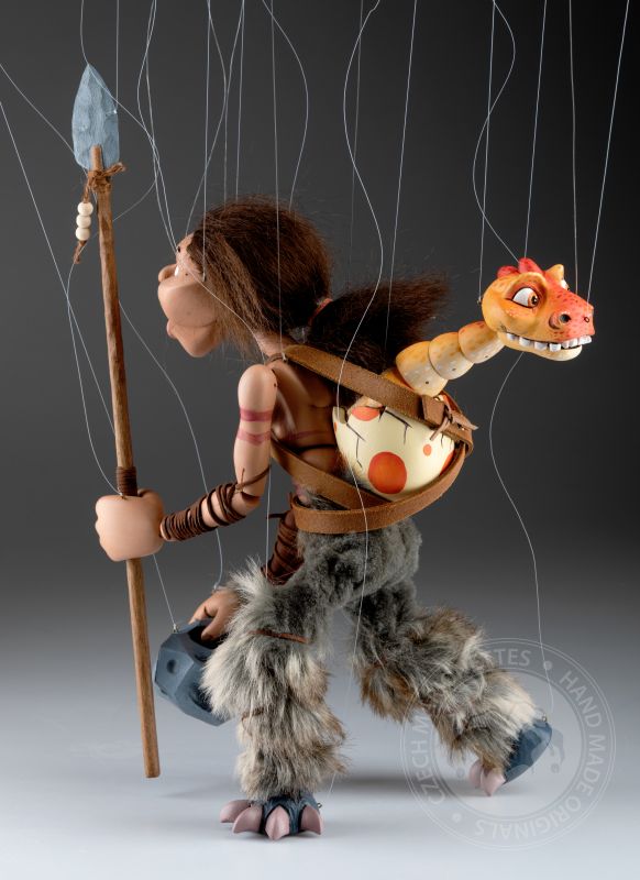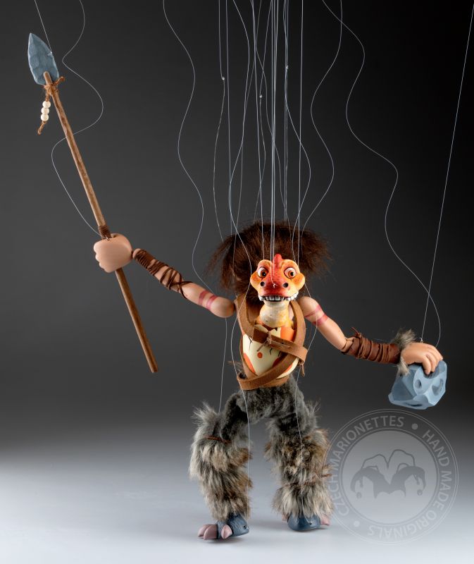 Este cavernícola lleva varias armas, como puedes ver: una lanza, una roca, un diente gigante en un palo, un colmillo y algunos peces en un palo. Su atuendo también es bastante destacado, hecho de cuero, piel artificial y tela. Sin embargo, la parte más adorable de esta marioneta es definitivamente el pequeño dinosaurio en un huevo roto que cuelga en la espalda del cavernícola.