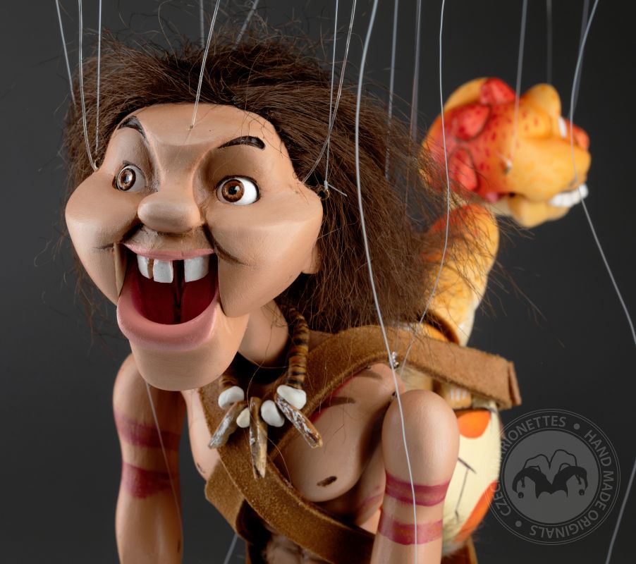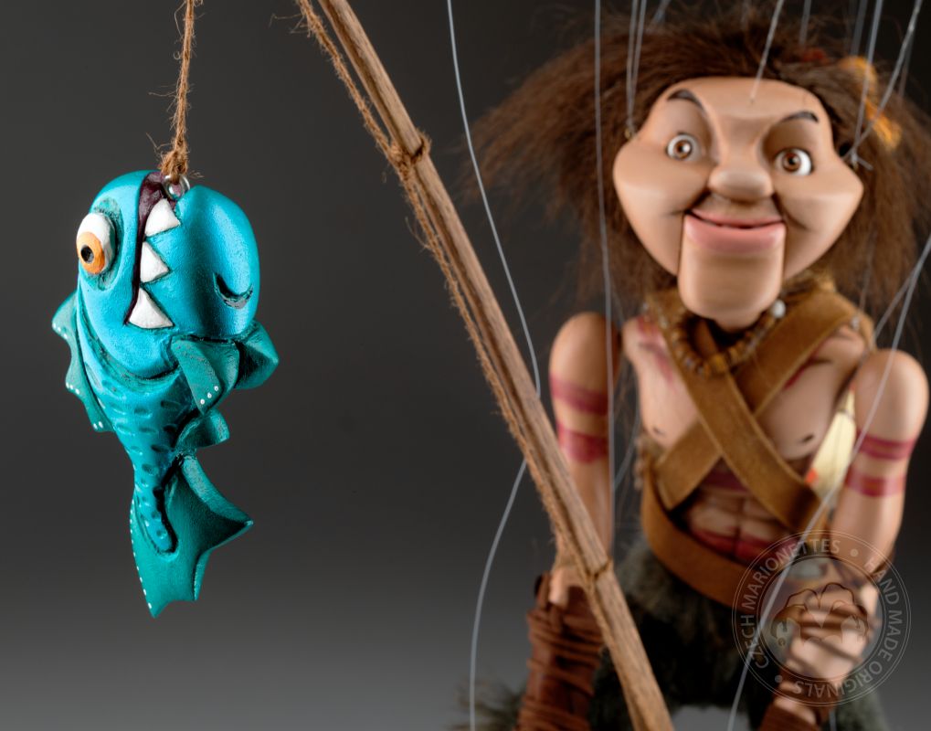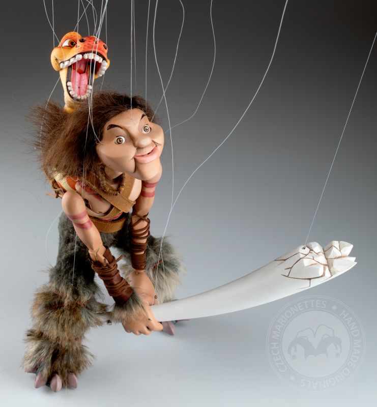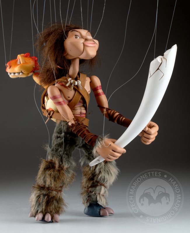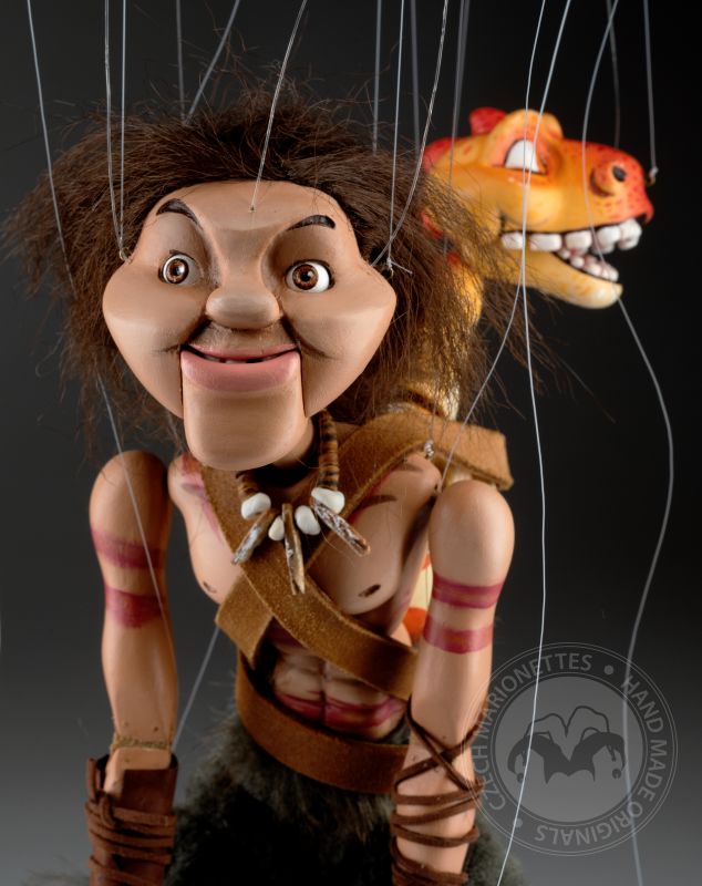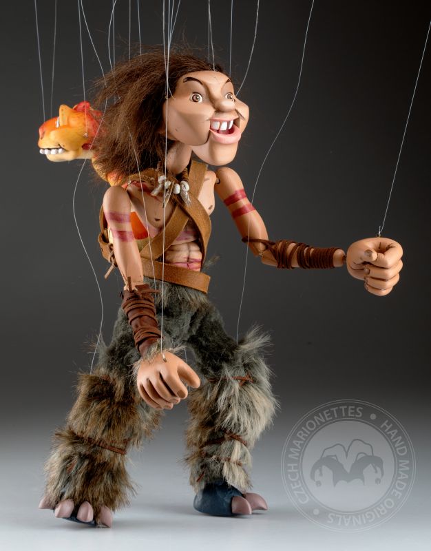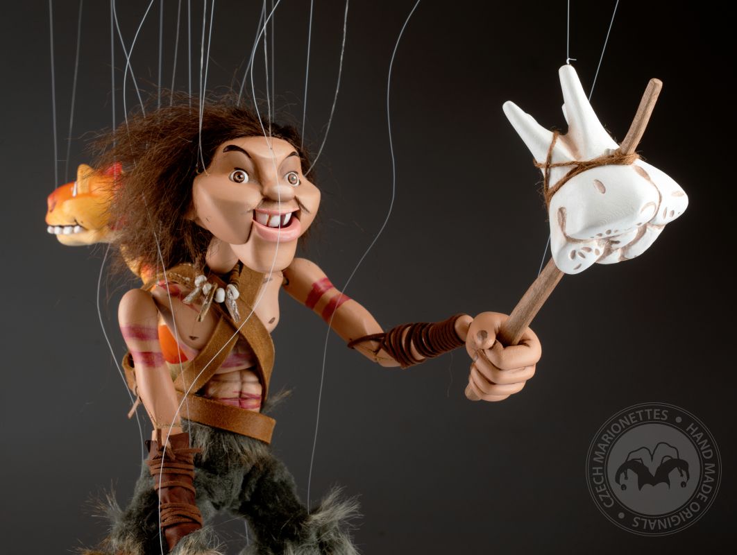 Este cavernícola lleva varias armas, como puedes ver: una lanza, una roca, un diente gigante en un palo, un colmillo y algunos peces en un palo. Su atuendo también es bastante destacado, hecho de cuero, piel artificial y tela. Sin embargo, la parte más adorable de esta marioneta es definitivamente el pequeño dinosaurio en un huevo roto que cuelga en la espalda del cavernícola.