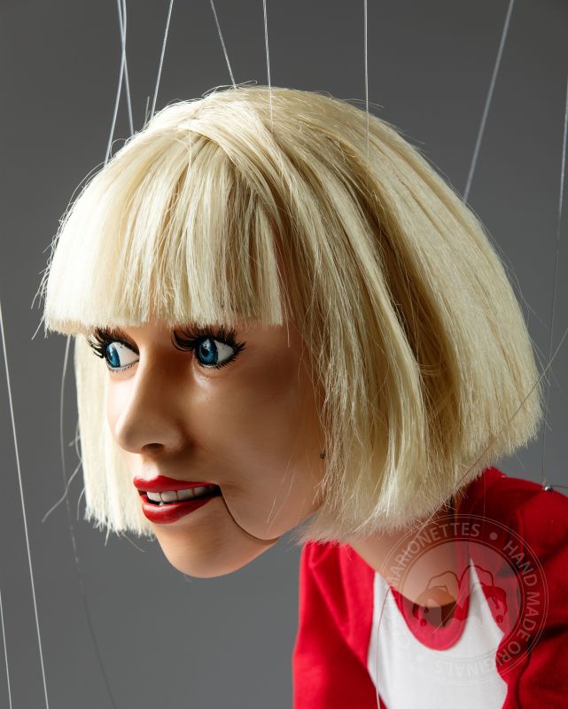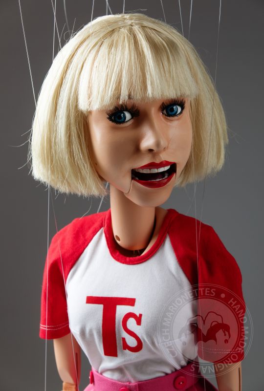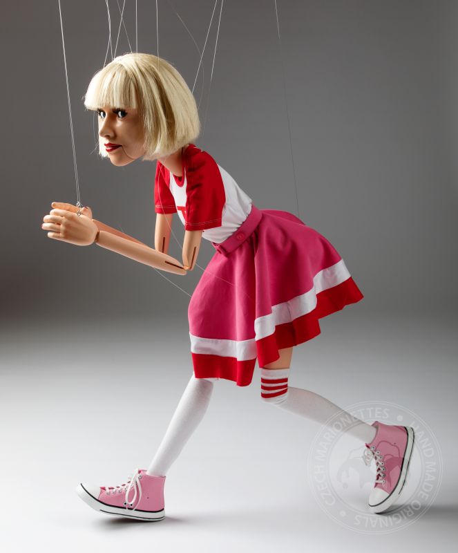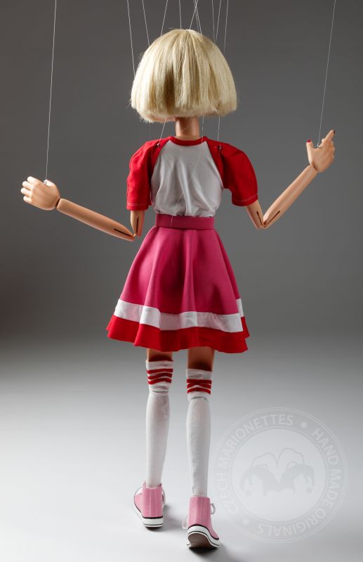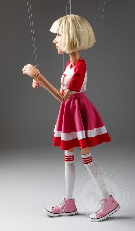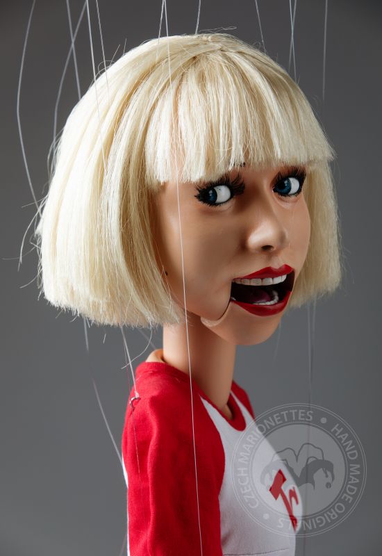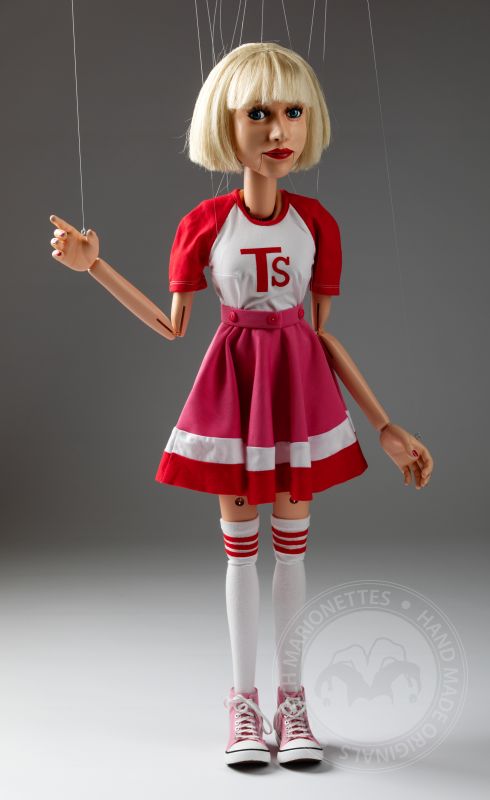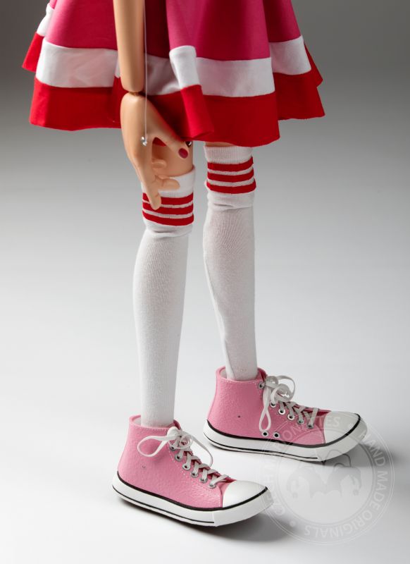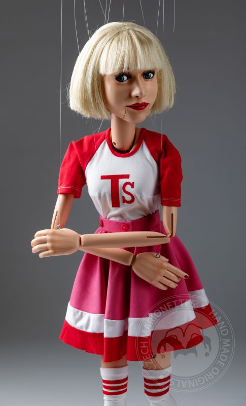 Vestida con un llamativo atuendo de animadora rojo y blanco, con accesorios detallados y un peinado cuidadosamente trabajado, esta marioneta es una pieza única. Ideal para coleccionistas, producciones teatrales o como un exclusivo objeto decorativo, representa una obra maestra en el arte de las marionetas.