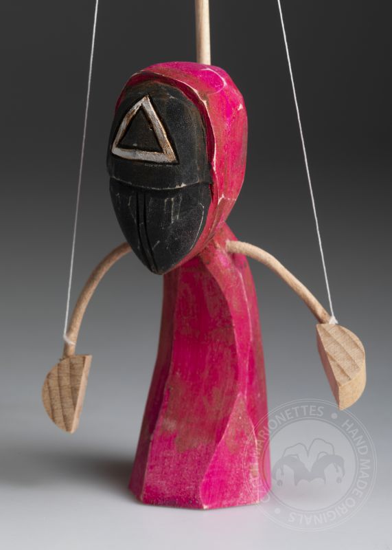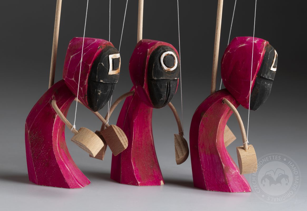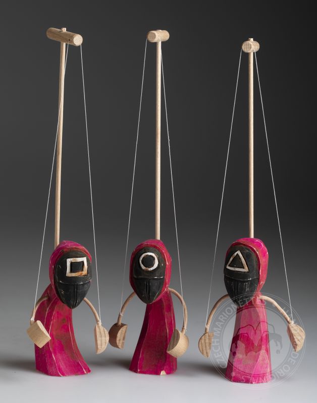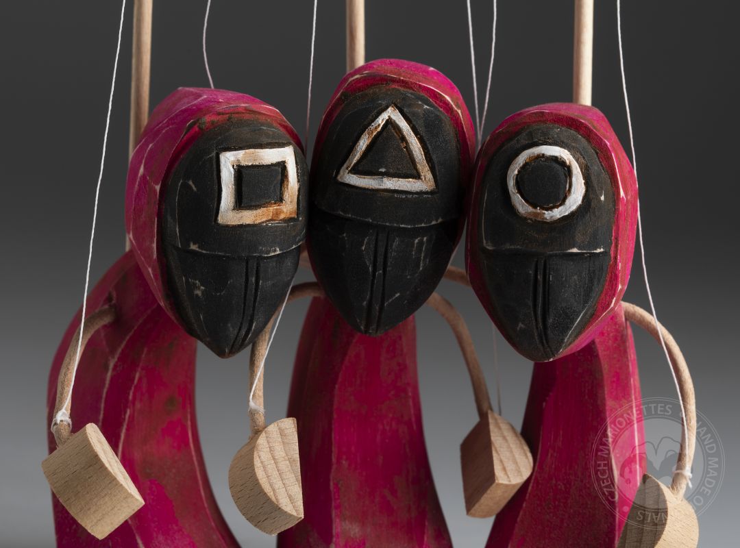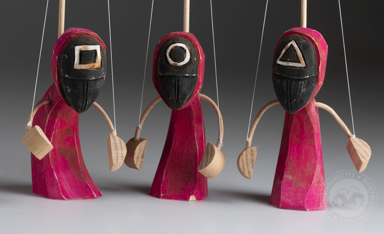 Estas marionetas minimalistas de madera, talladas a mano, representan a los icónicos guardianes enmascarados de la serie Squid Game. Cada uno lleva un símbolo – círculo, triángulo o cuadrado – que señala su jerarquía dentro del juego, ahora reinterpretado de forma artística y lúdica.