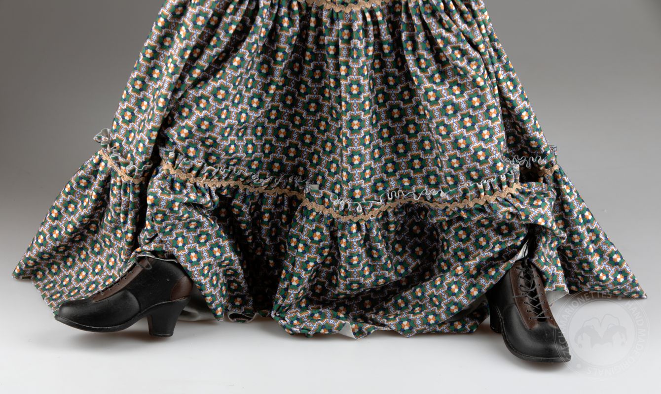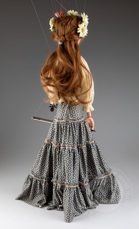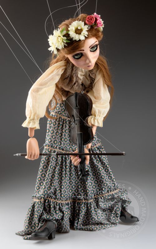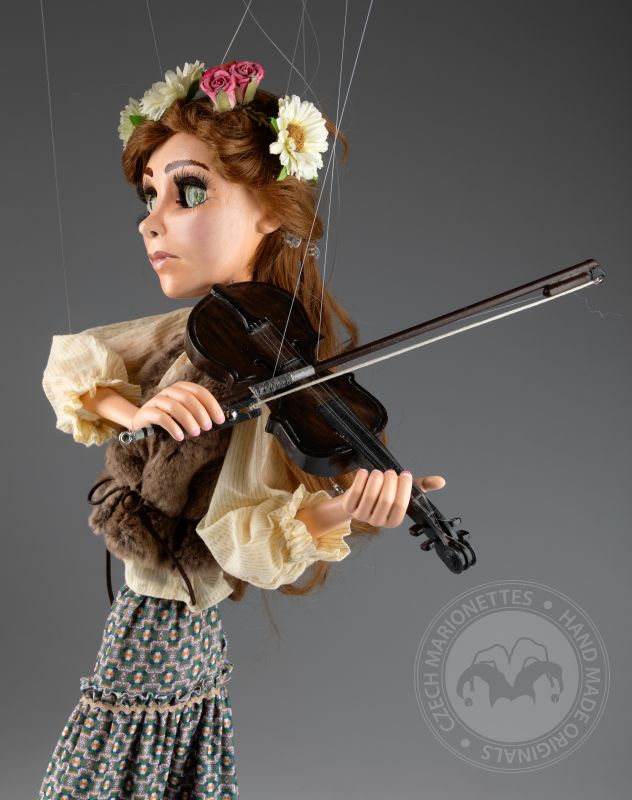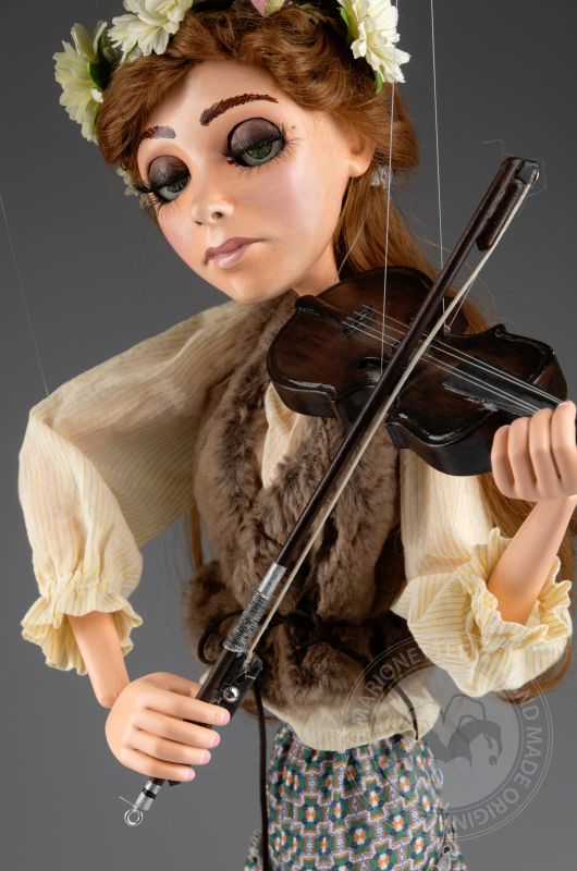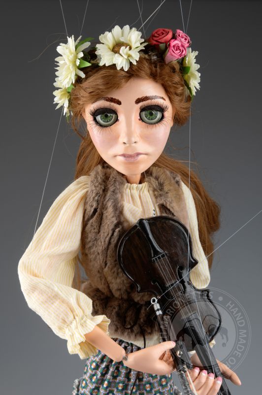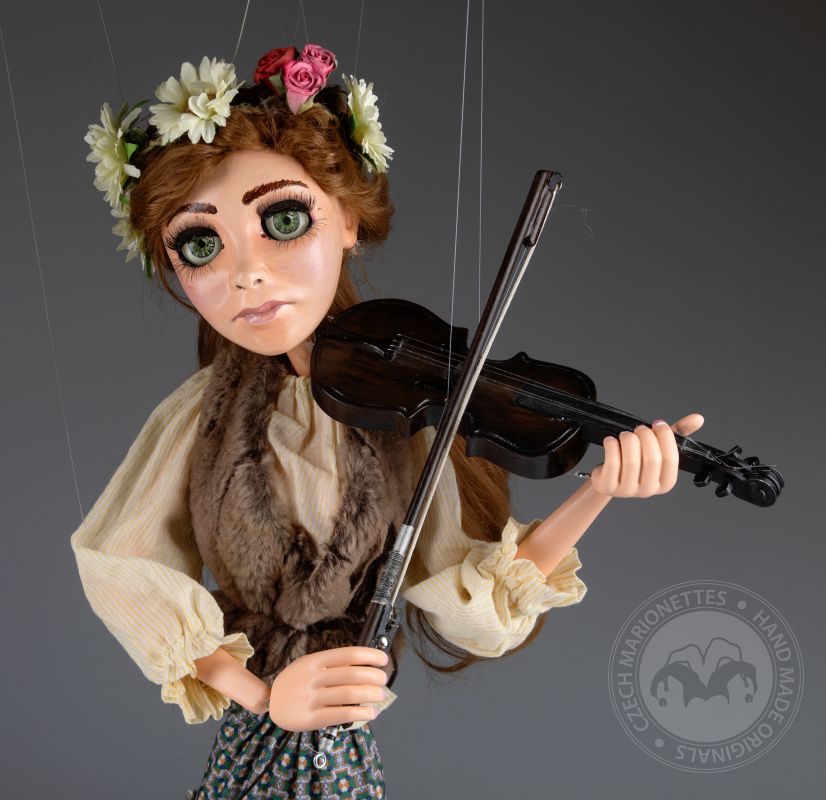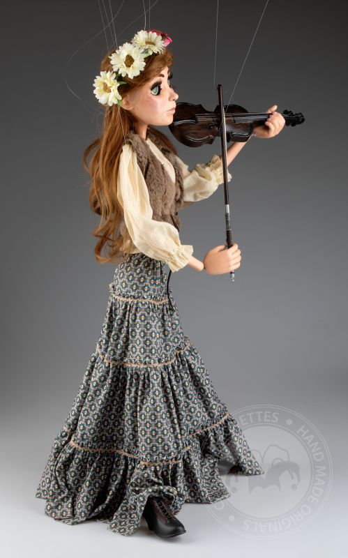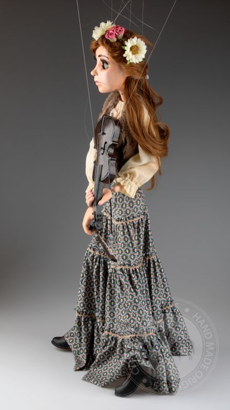 Su traje tradicional de estilo folclórico, que incluye un chaleco detallado y una falda fluida con patrones, está hecho de telas de alta calidad que se mueven de manera natural con los gestos de la marioneta. Cada detalle, desde su rostro pintado a mano hasta el violín realista, refleja la habilidad y el cuidado puestos en su creación.