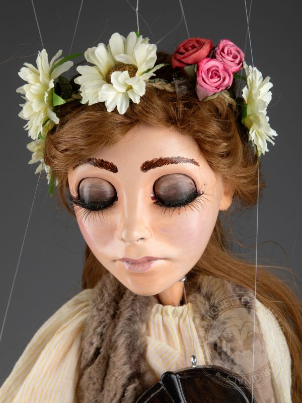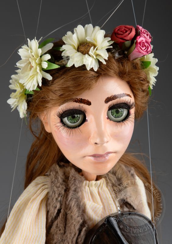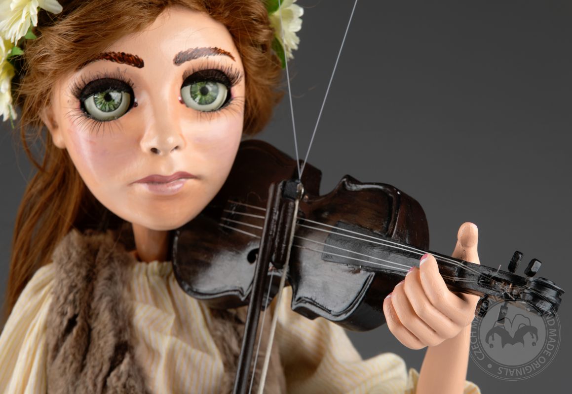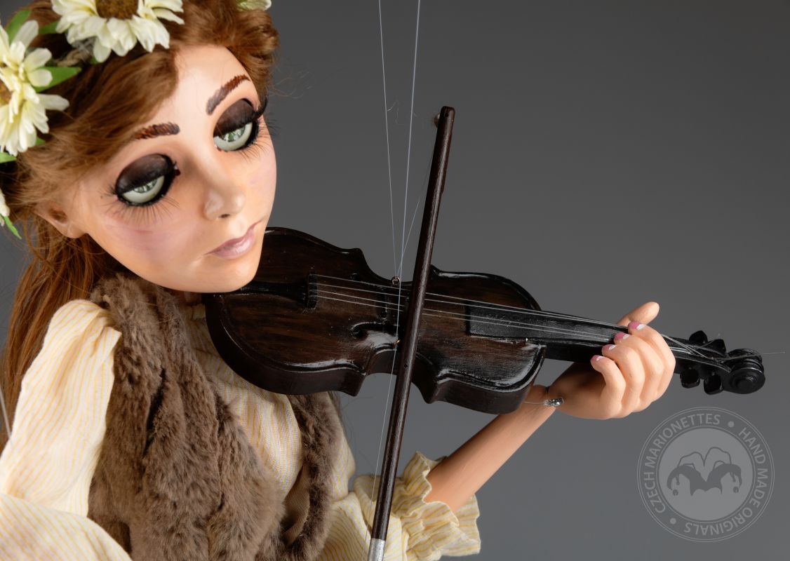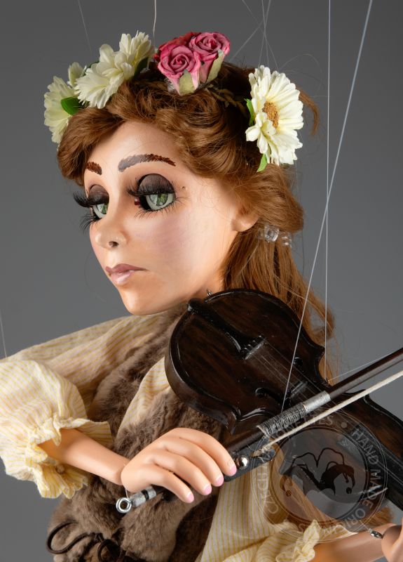 Haz que la música cobre vida con esta marioneta de violinista, diseñada para su uso en el escenario. Esta hermosa marioneta captura la esencia de una músico con su rostro tranquilo, su cabello flotante y su delicada corona de flores. Sostiene un violín tallado a mano y un arco, lista para tocar.
