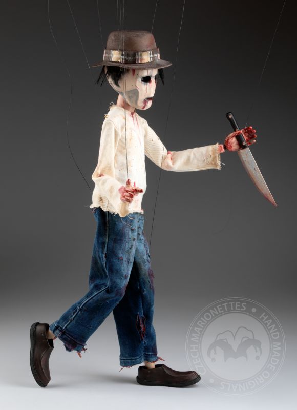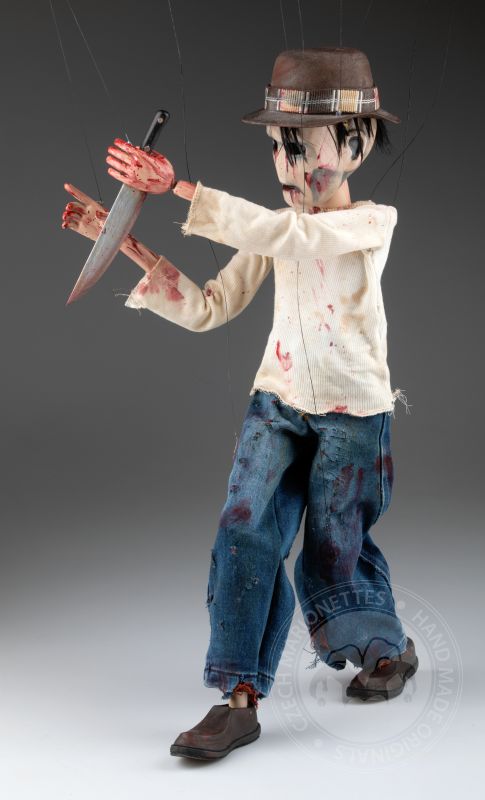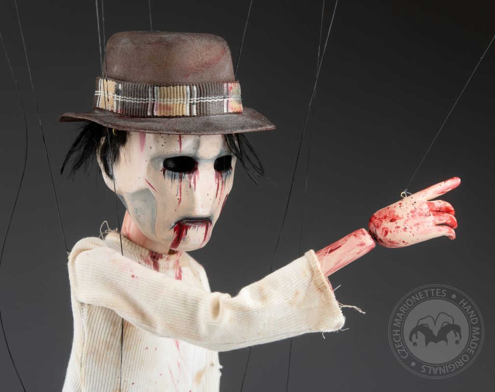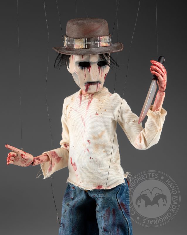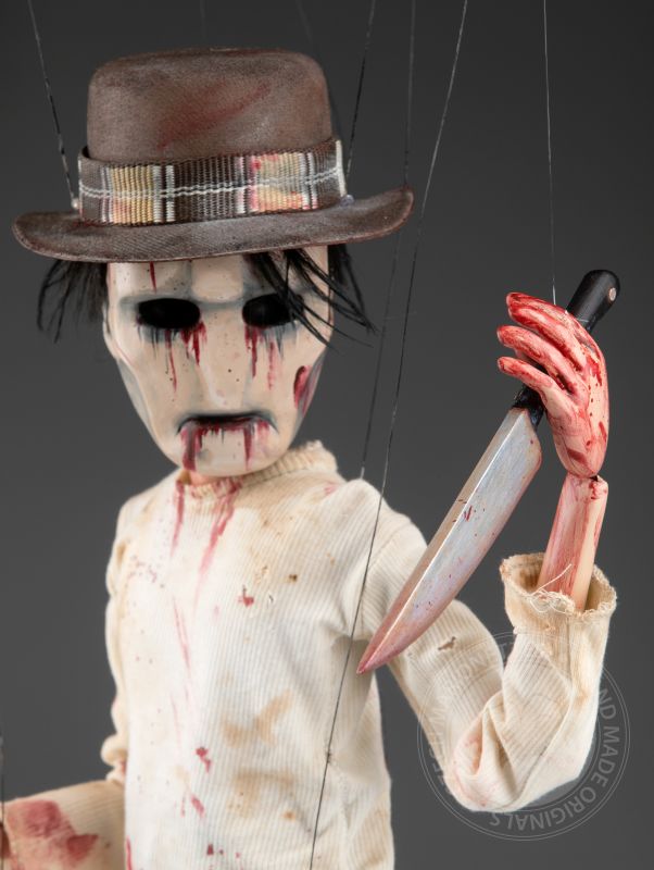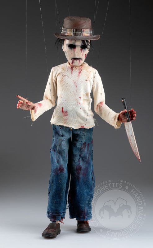 Esta marioneta hecha a mano está inspirada en los clásicos villanos del cine slasher y los juegos de mesa de terror. Totalmente artesanal y pintada a mano, aporta una atmósfera aterradora a cualquier escenario o colección.