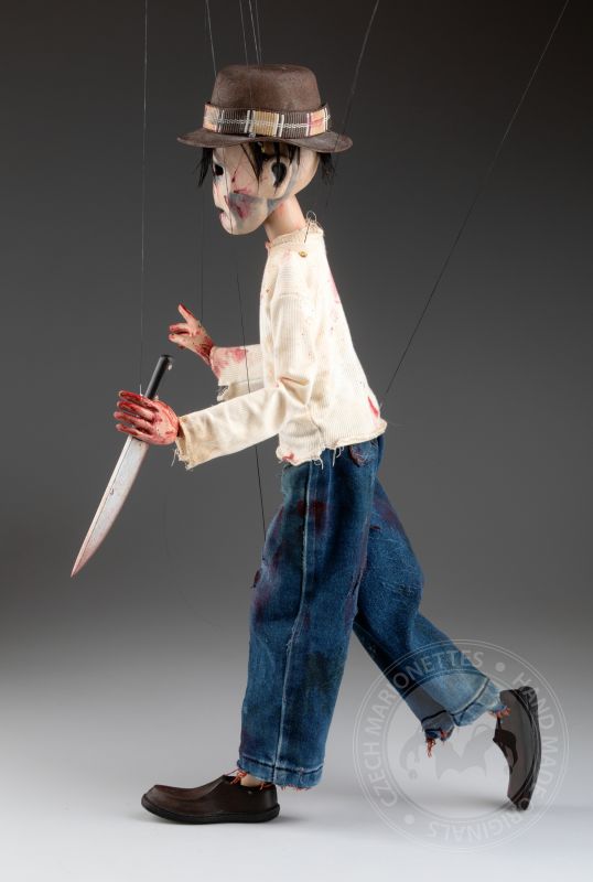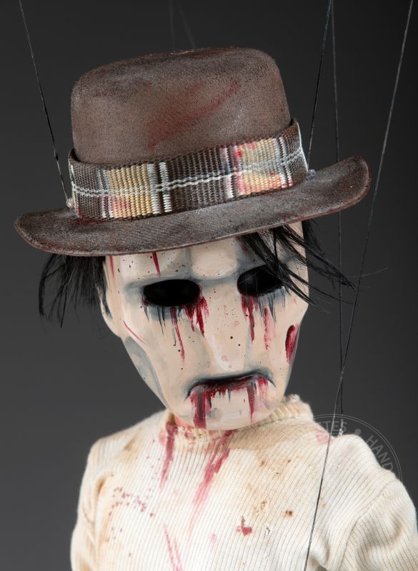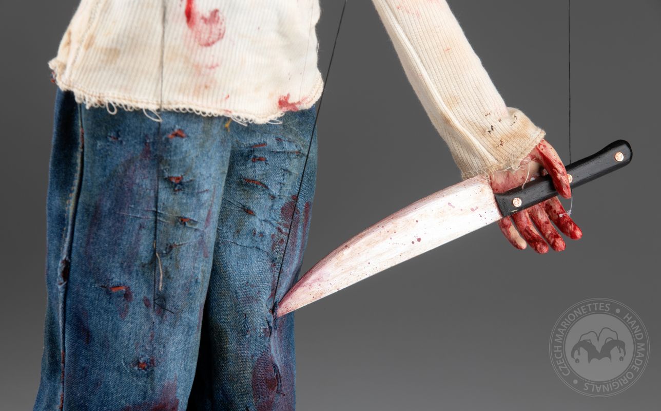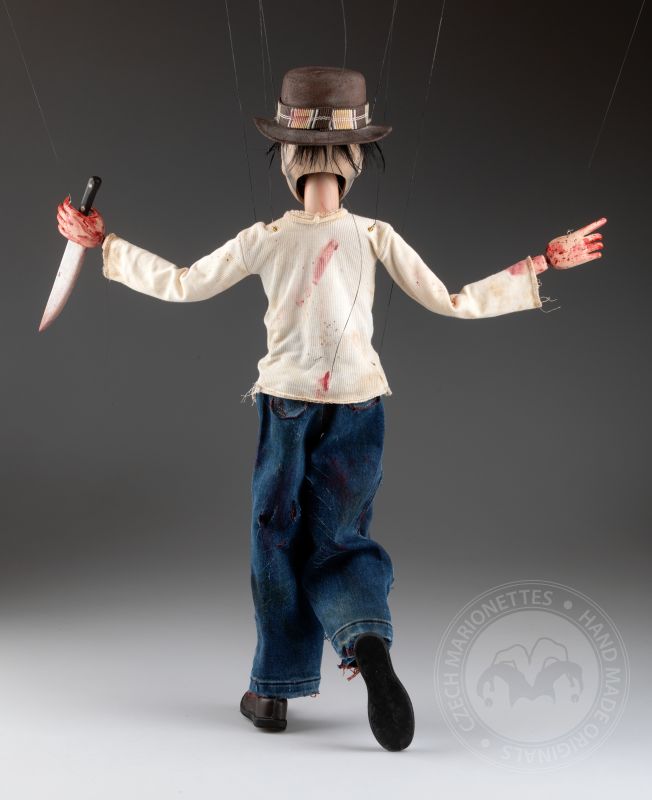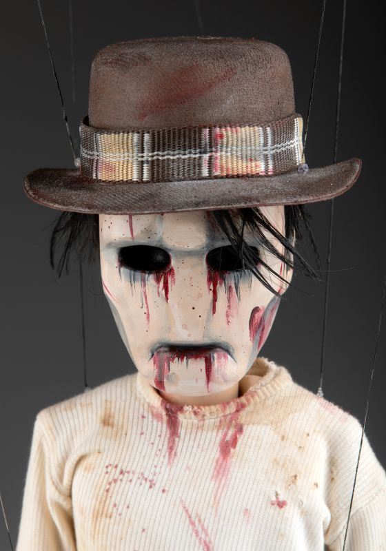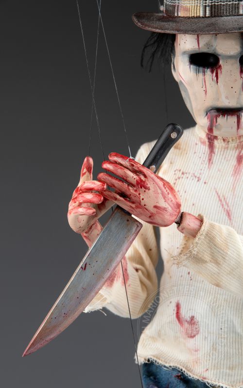 Marioneta de terror hecha a medida, inspirada en los clásicos villanos de películas slasher y el mundo de los juegos de mesa como Final Girls. Una marioneta artesanal, aterradora y llena de detalles espeluznantes – ideal para coleccionistas y amantes del horror.