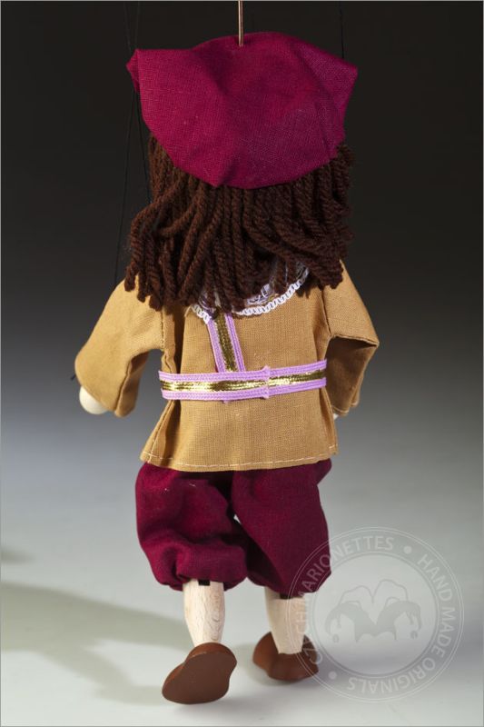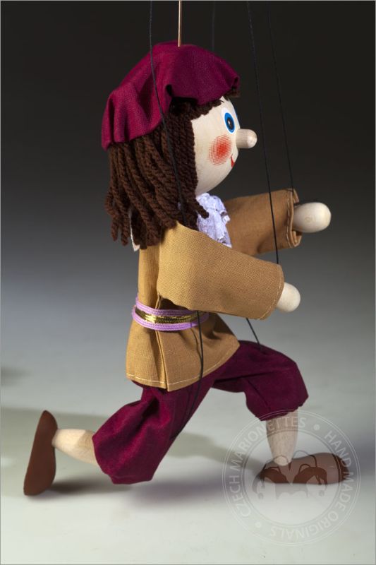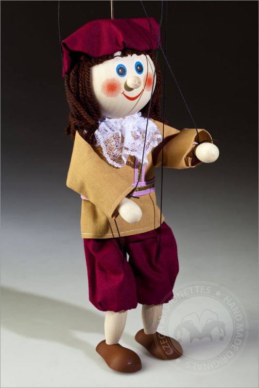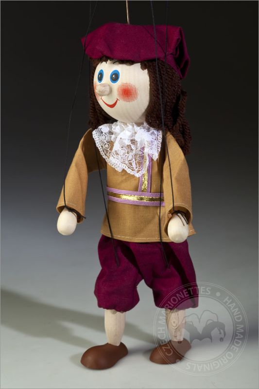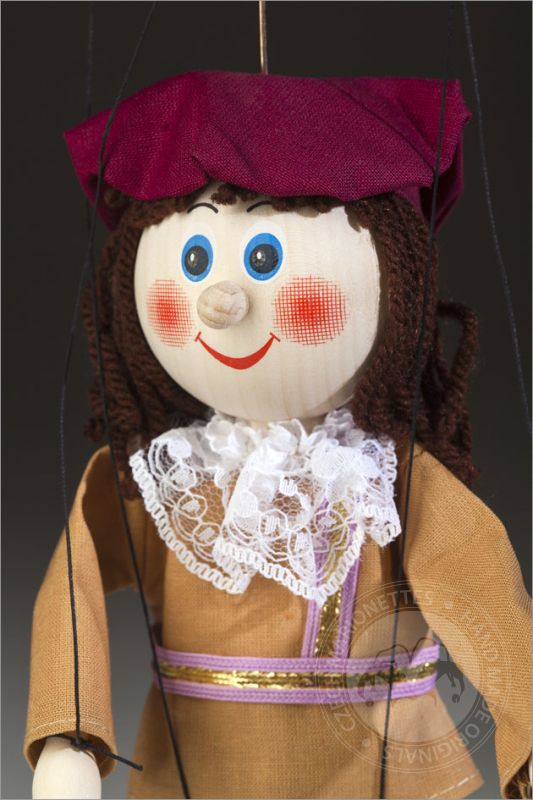 El príncipe Charlie lleva una blusa beige con encaje alrededor del cuello, pantalones cortos morados y un sombrero a juego. Es joven y lleno de energía. Su atuendo está cuidadosamente cosido a mano y su rostro está pintado a mano. Es una excelente marioneta para jugar. Simple, pero efectiva. Incluye dispositivo de manejo.