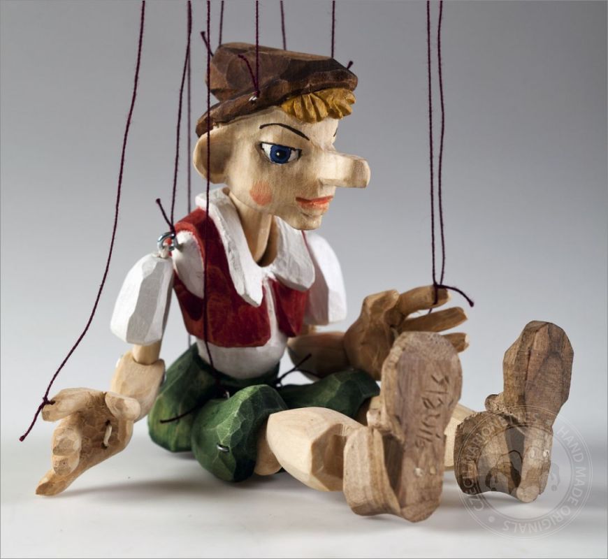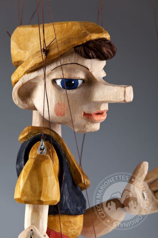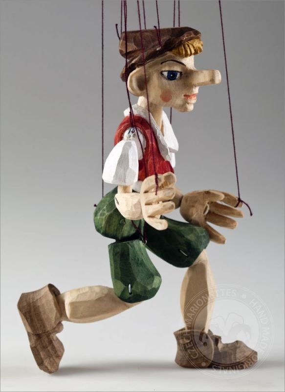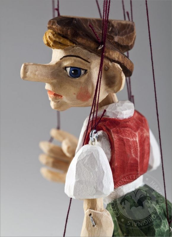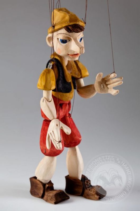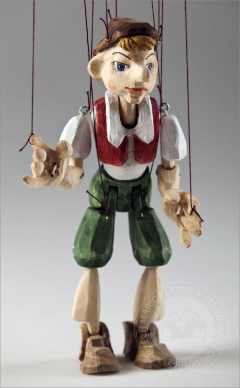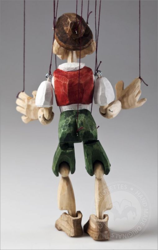 Pinocho tallado a mano con precisión en madera de tilo Esta versión más pequeña de nuestra marioneta de madera de Pinocho es ideal para aquellos que desean tener una marioneta duradera tallada a mano a un precio asequible. Es muy fácil jugar con él y merece la atención de los artistas jóvenes. Sus articulaciones especiales hacen que sus movimientos sean aún más fluidos. Este Pinocho lleva una camisa blanca, chaleco rojo y pantalón verde oscuro. Un conjunto muy bonito y con mucha clase para este niño. Tenemos que admitir que nuestra pequeña marioneta Pinocho es una verdadera obra maestra realizada por un experimentado titiritero checo. Cada centímetro está tallado a mano en madera de tilo y toda la creación es ecológica. Una marioneta como esta definitivamente te molestará. Cuanto más juegas con él, más recuerdos obtienes. Es un juguete de madera para toda la vida que hace sonreír a los mayores como a los más pequeños.