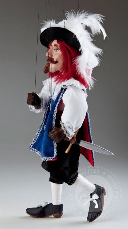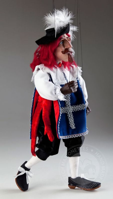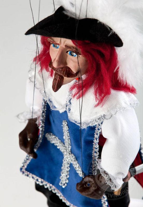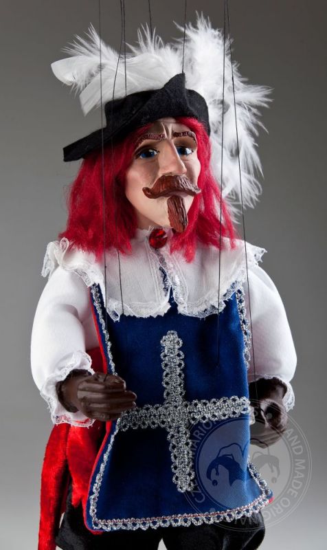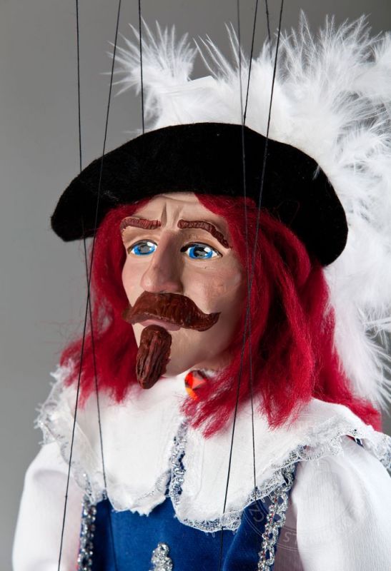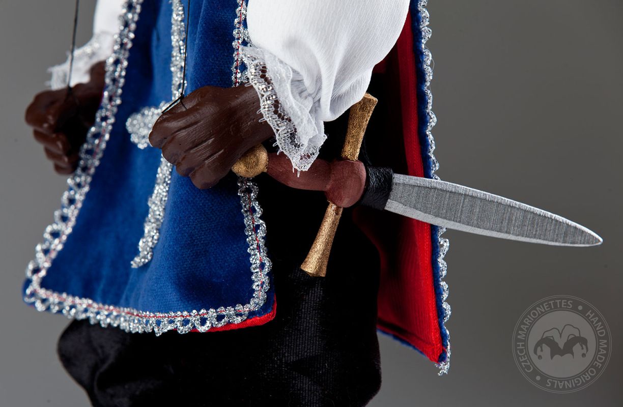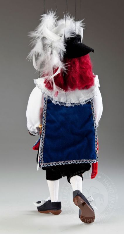 ¡Siempre dispuesto a luchar por su país y la dama en su corazón! Valentía, honestidad y tal vez incluso una pizca de tristeza secreta: estas emociones son exactamente lo que puedes leer en la expresión facial del mosquetero Andre. Viste una camisa blanca con cuello grande, pantalones cortos de terciopelo negro y un chaleco azul con una cruz plateada bordada en el pecho. Su gran sombrero negro con plumas y su espada son fantásticos accesorios y son típicos del look de mosquetero. Mide 16 pulgadas de alto. Esta maravillosa marioneta hecha a mano es miembro de la Colección de Marionetas Checas de la Corte Real. El trabajo detallado en su cara pintada a mano y en la ropa cosida a mano hacen que nuestro mosquetero André Czech Marionette sea aún más especial. Definitivamente es un juguete único, ¡un gran regalo para cualquier generación!