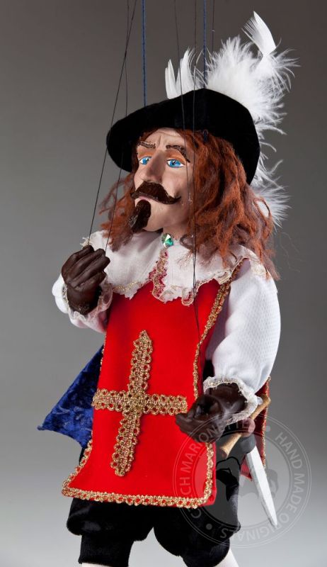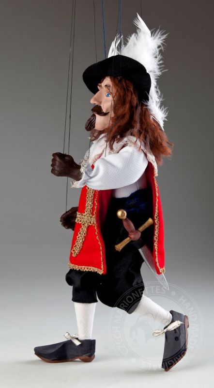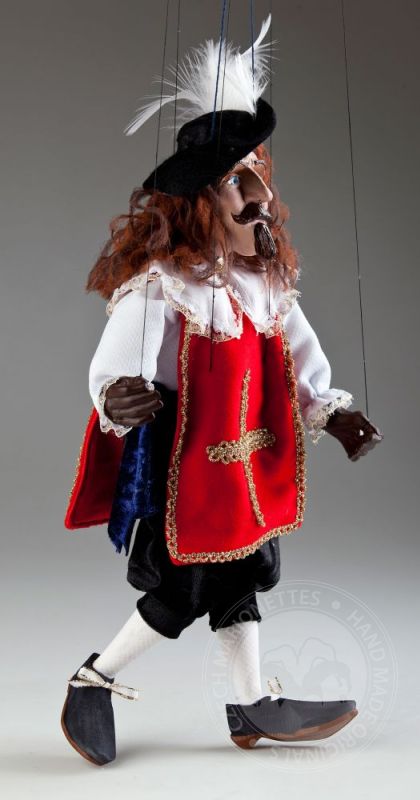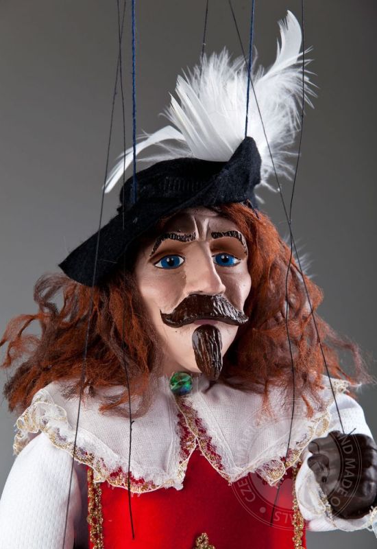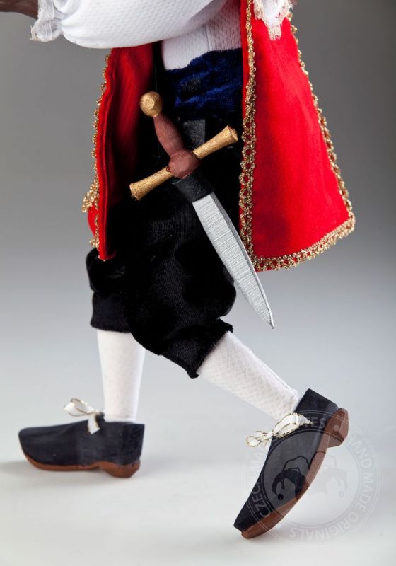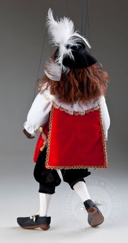 ¡Siempre dispuesto a luchar por su país y la señora de su corazón! Valentía, honestidad y tal vez incluso una pizca de dolor secreto: eso es exactamente lo que se puede leer en la expresión facial del mosquetero Pierre. Viste una camisa blanca con cuello grande, pantalones cortos de terciopelo negro y un chaleco rojo con una cruz dorada bordada en el pecho. El gran sombrero negro con plumas y la espada que sostiene son excelentes accesorios típicos del look de mosquetero. Mide 16 pulgadas de alto. Esta maravillosa marioneta hecha a mano es miembro de la Colección de Marionetas Checas de la Corte Real. El trabajo detallado en su cara pintada a mano y su ropa cosida hacen que nuestra marioneta checa del mosquetero Pierre sea aún más especial. Definitivamente es un juguete único, ¡un gran regalo para cualquier generación!Tenga en cuenta que cada marioneta es una obra de arte original y puede diferir ligeramente de las imágenes de arriba. Por ejemplo, la ropa o el color del pelo pueden ser diferentes, dependiendo de la disponibilidad de los materiales.