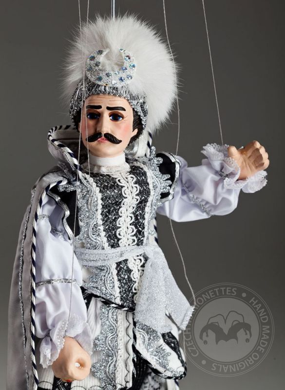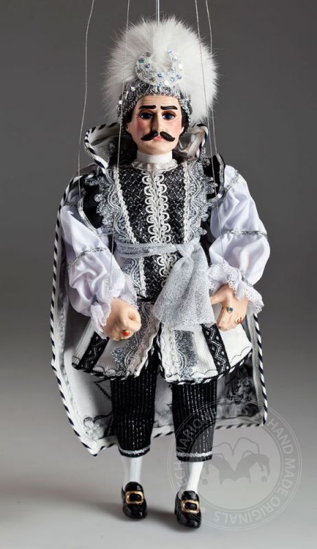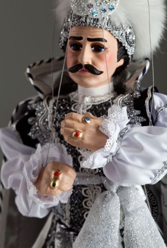 Esta marioneta del Príncipe Negro es única gracias a su diseño detallado, pintura a mano, y la hermosa combinación de tonos grises y plateados en su vestimenta. Evoca una atmósfera de cuento de hadas, ideal tanto para la habitación de los niños como para una colección de marionetas. El Príncipe Negro es un caballero valiente que siempre protegerá a su dama.