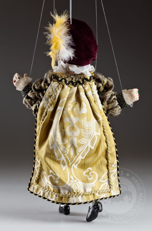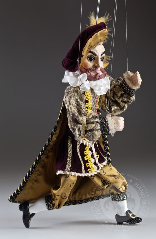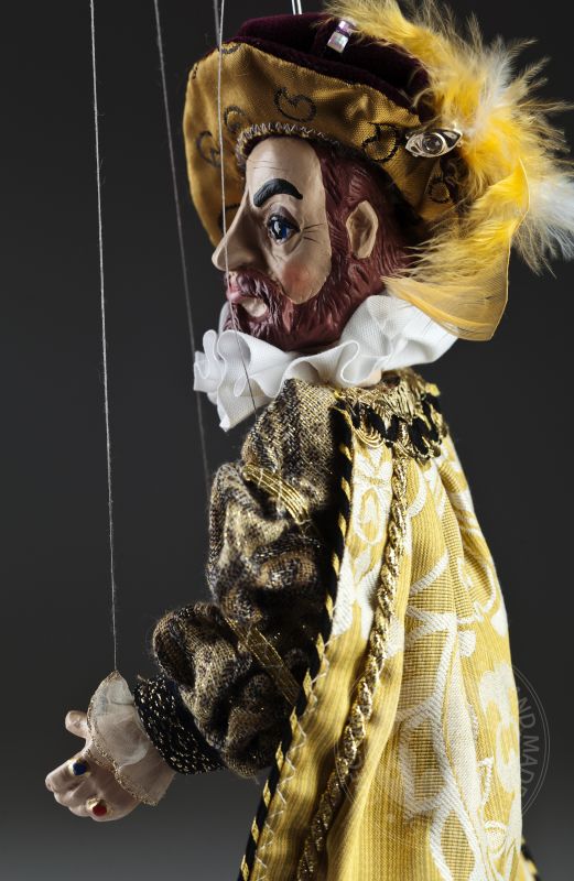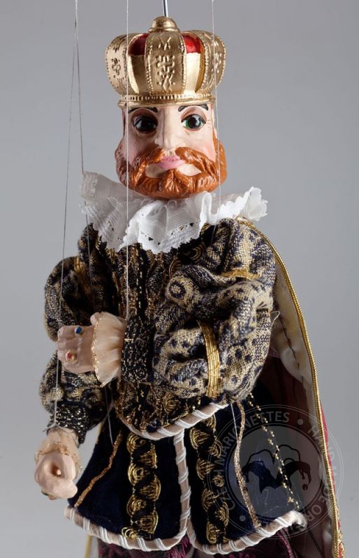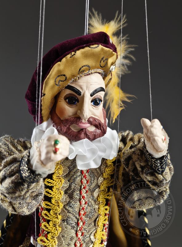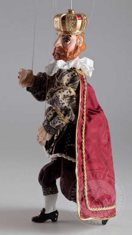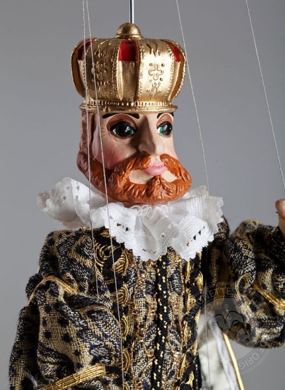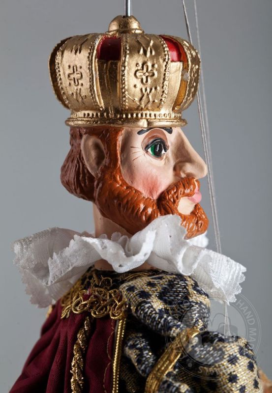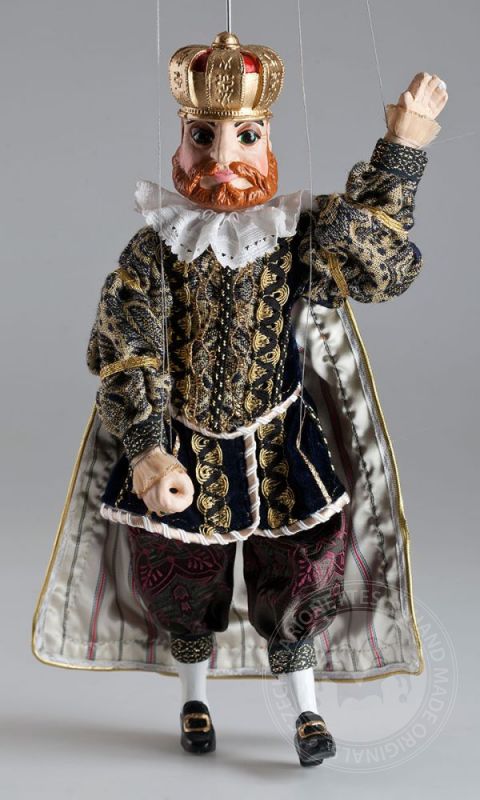 Actualmente disponible con una corona o un hermoso sombrero representativo. Por favor, indica tu elección en la nota de pedido. Si no llenas la nota, aceptas nuestra elección. Marionetas como el Rey Rudolf se producen en ediciones limitadas de pocas piezas. La cabeza, los brazos y las piernas están moldeados y pintados a mano, mientras que el cuerpo (esqueleto) está hecho de madera de tilo. La marioneta tiene un control tradicional, conectada al controlador mediante un alambre, y los hilos clásicos se utilizan para mover las manos y los pies.