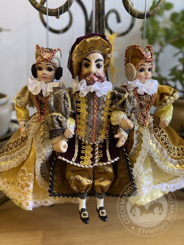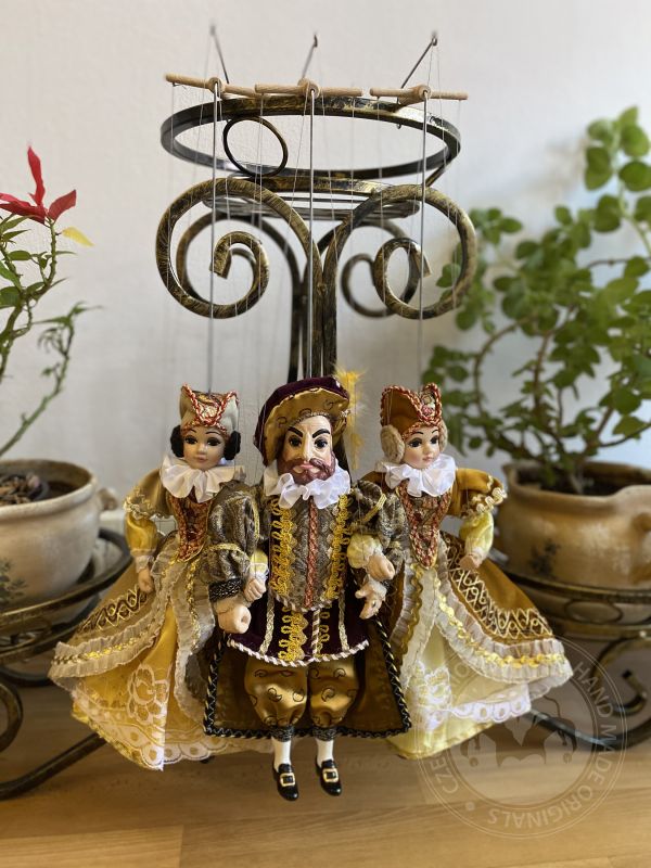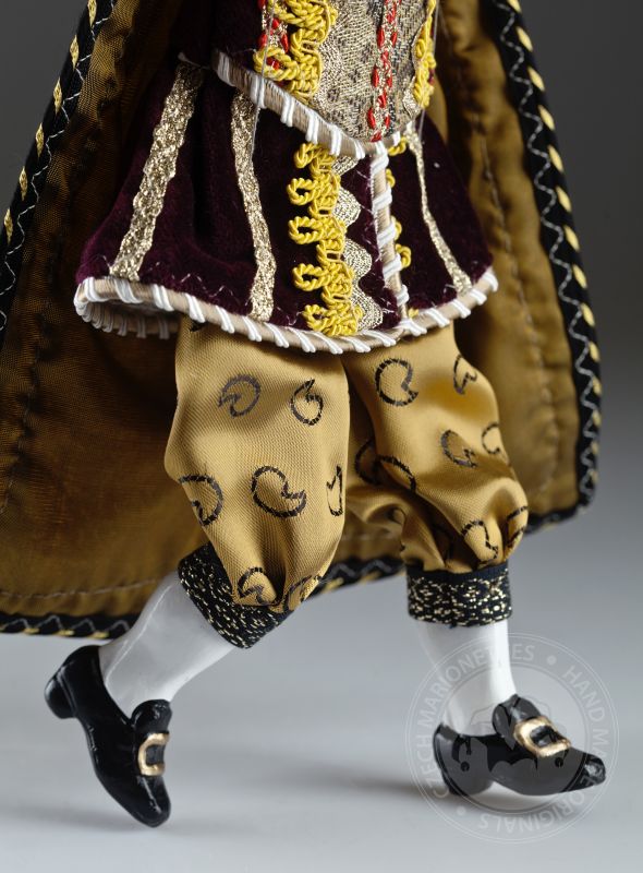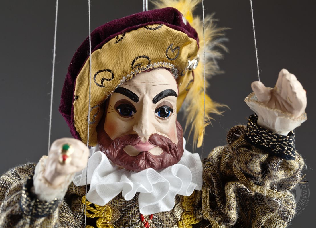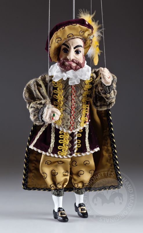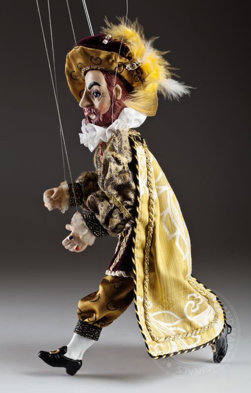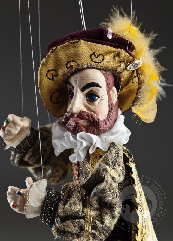 Actualmente disponible con una corona o un hermoso sombrero representativo. Por favor, indica tu elección en la nota de pedido. Si no llenas la nota, aceptas nuestra elección. Marionetas como el Rey Rudolf se producen en ediciones limitadas de pocas piezas. La cabeza, los brazos y las piernas están moldeados y pintados a mano, mientras que el cuerpo (esqueleto) está hecho de madera de tilo. La marioneta tiene un control tradicional, conectada al controlador mediante un alambre, y los hilos clásicos se utilizan para mover las manos y los pies.