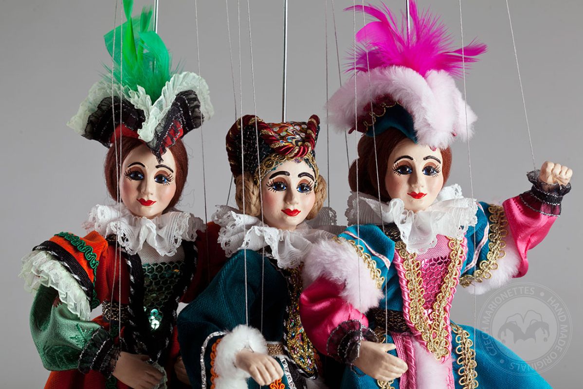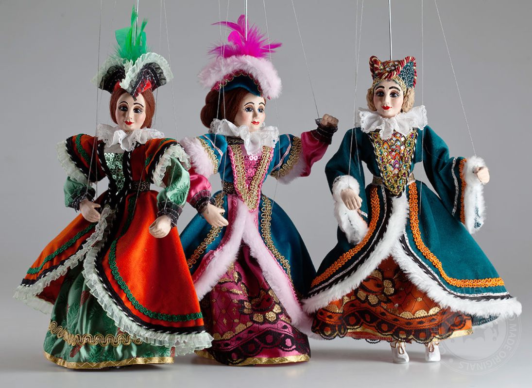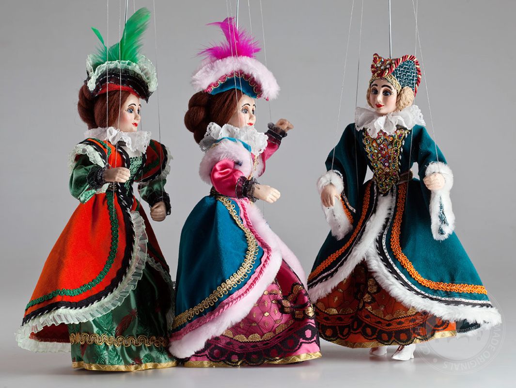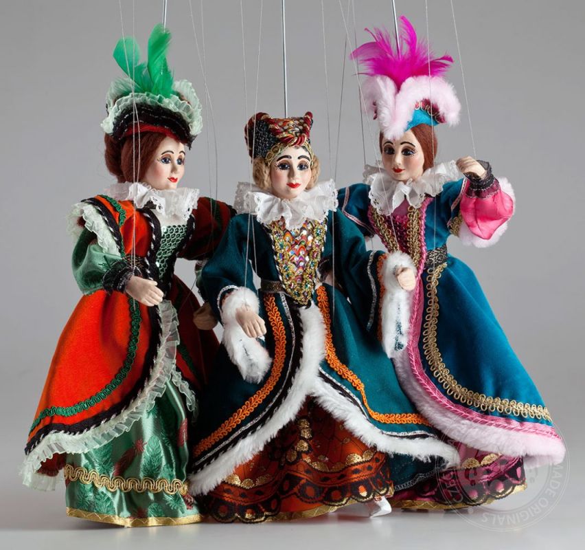 Hermosas marionetas de damas vestidas con trajes ricamente decorados. La foto es solo un ejemplo del estilo; deja que te sorprendamos con las marionetas que seleccionaremos especialmente para ti...