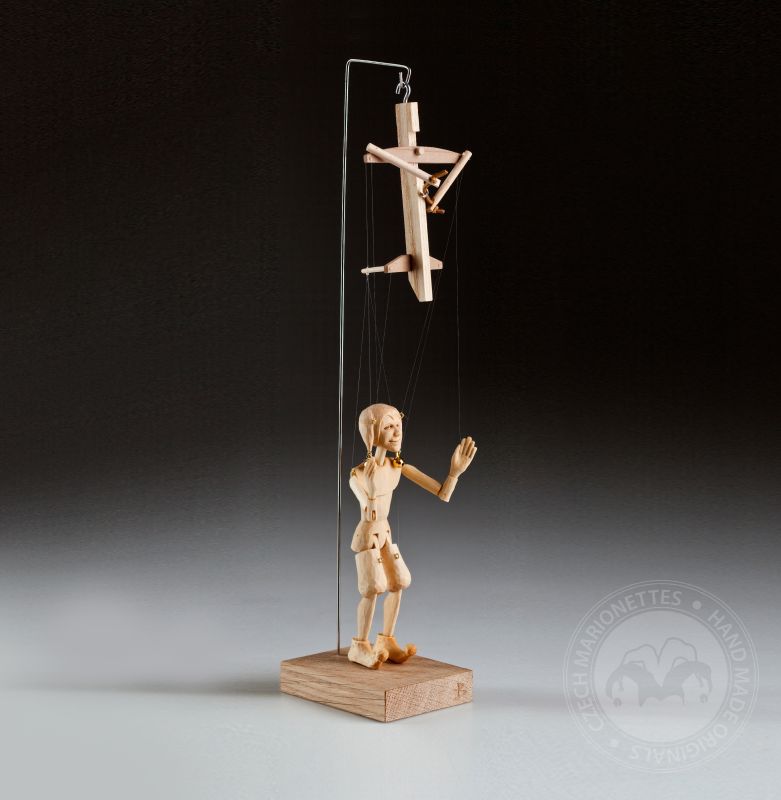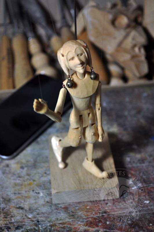 Esta marioneta es obra de uno de nuestros grandes titiriteros. Cada corte de esta marioneta tallada a mano debe estar bien pensado. ¡Cada fibra de madera importa! Con la función de una marioneta profesional y su precisión podemos afirmar felizmente que esto sólo lo pueden hacer un par de personas del mundo. Esta marioneta viene con soporte.