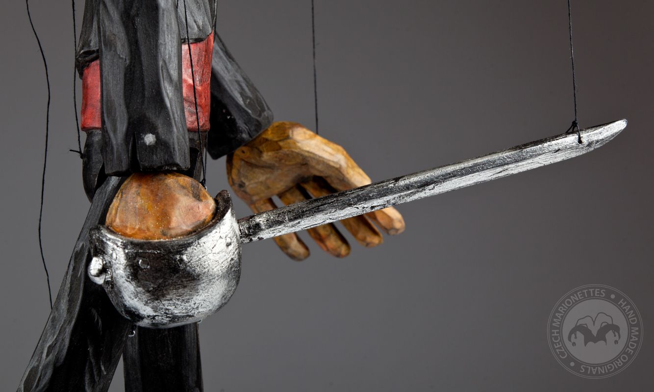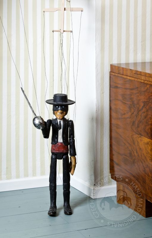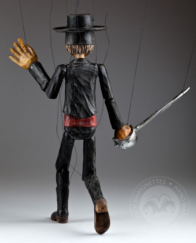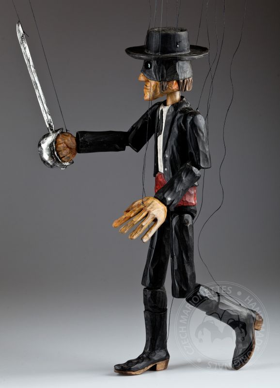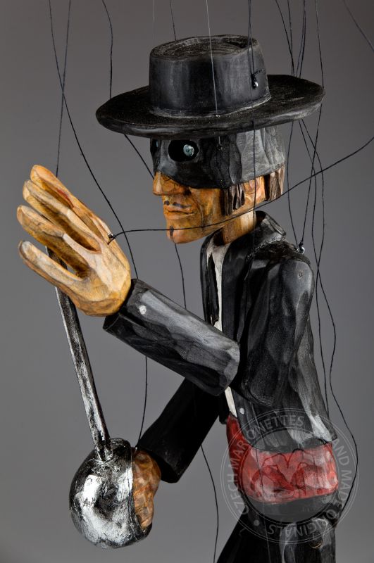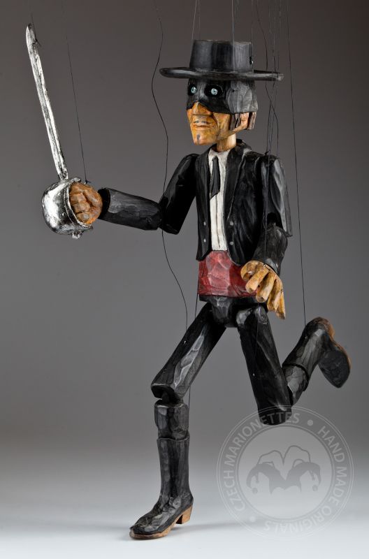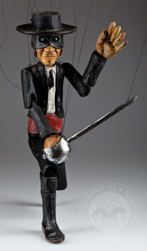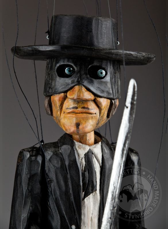 Encantador, apuesto y defensor del pueblo. Zorro definitivamente tiene las habilidades para meterse bajo tu piel. Esta marioneta captura perfectamente las cualidades que vemos en las películas. Lleva su famoso disfraz: sombrero negro, máscara, chaqueta y pantalones negros con fajín rojo. Porta su arma favorita, una espada rapiera. La pintura a mano realmente añade a su misterio. Ya estamos encantados y fascinados por su historia. Sus movimientos le permiten actuar a nivel semiprofesional o simplemente estar de pie como una pieza heroica en tu hogar.