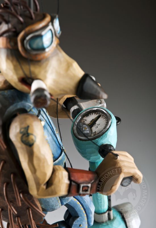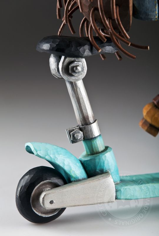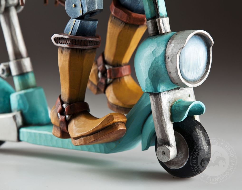 La mecánica es clásica, como en otras marionetas de Jakub: un balancín, un alambre y una conexión básica con una movilidad muy decente. El scooter está separado, por lo que el erizo es en realidad una marioneta con accesorios :)