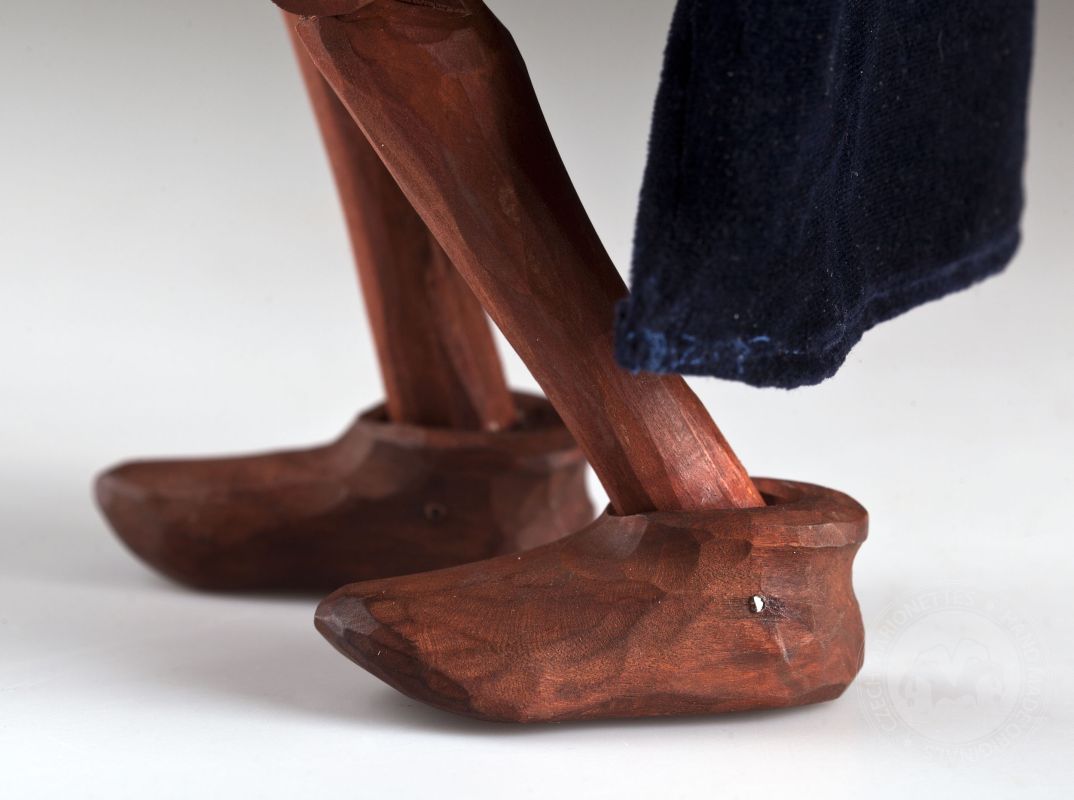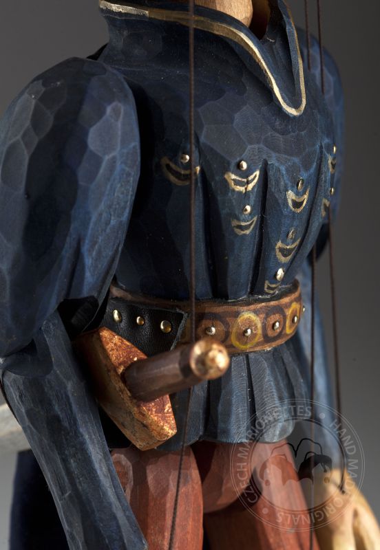 Príncipe en estilo retro de marionetas antiguas La marioneta original recuerda más a sus ancestros históricos que la mayoría de las demás. A primera vista, parece que puede tener cien años o más. Esto se debe a la admirable estilización y a la convincente pátina. El controlador clásico y la correa del títere ciertamente ayudan a esta impresión. La cabeza está unida al dispositivo de control con alambre, las extremidades están atadas clásicamente con hilos. Esta marioneta tallada a mano es muy fácil de usar, incluso si sólo es capaz de realizar movimientos básicos.