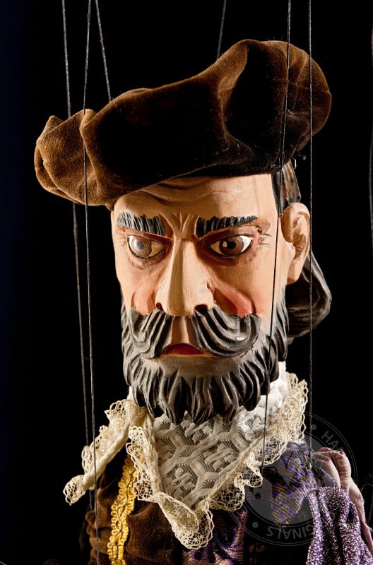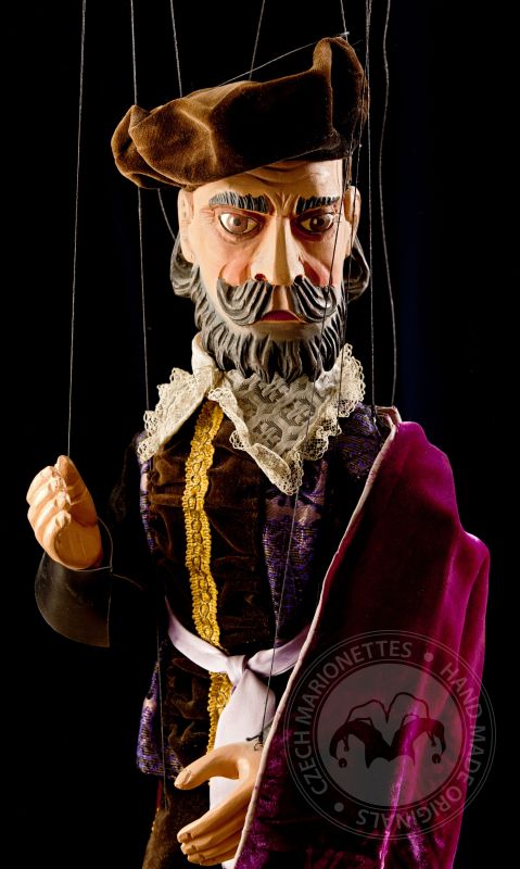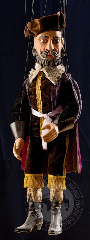 Cette belle marionnette antique faite à la main d'un noble est une véritable rareté dans notre collection. Son beau manteau, comme son costume, est en velours et son cou est entouré de dentelle. Ses chaussures et sa barbe sont taillées dans le bois, elles imitent fidèlement leurs véritables sources d'inspiration. Remarquez également les franges jaunes ludiques qui ornent son pantalon. Tous les matériaux utilisés pour fabriquer cette marionnette sont originaux et de très bonne qualité.
