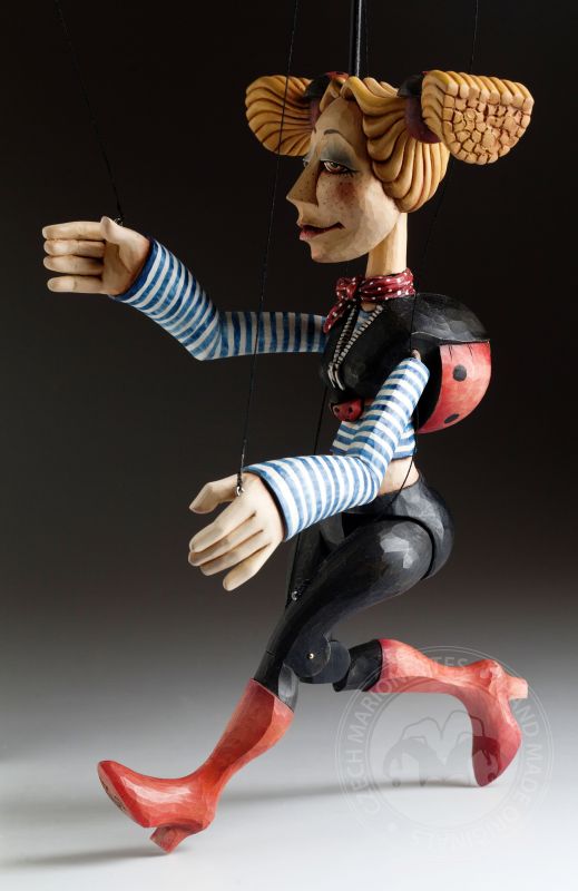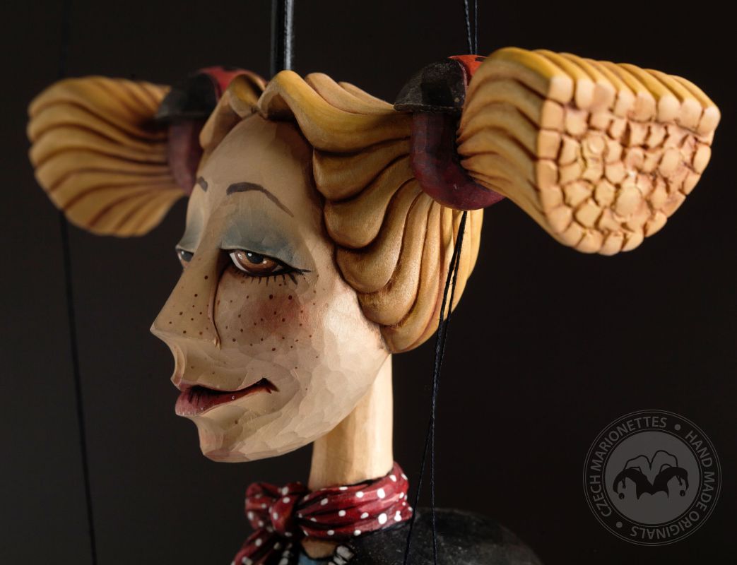 Superbe marionnette féminine en bois soigneusement sculptée à la main dans du tilleul par le marionnettiste Jakub Fiala.