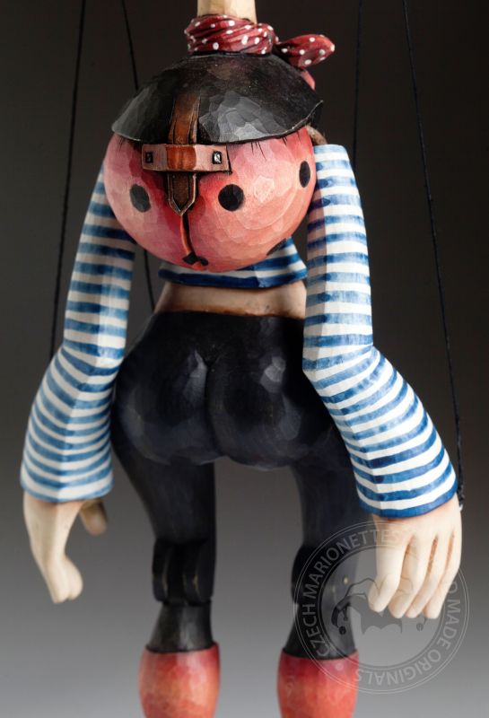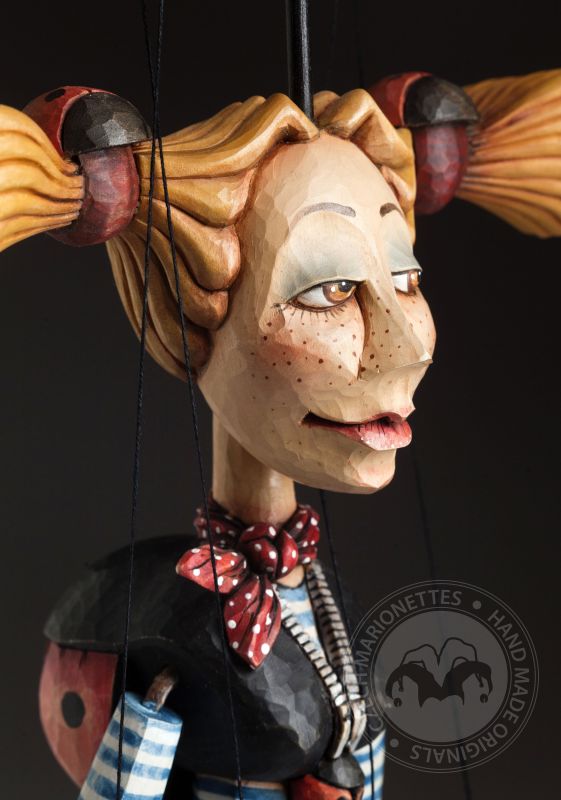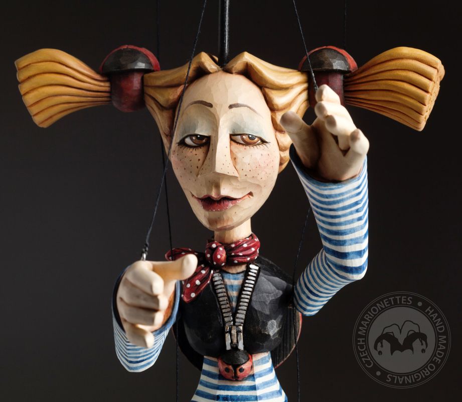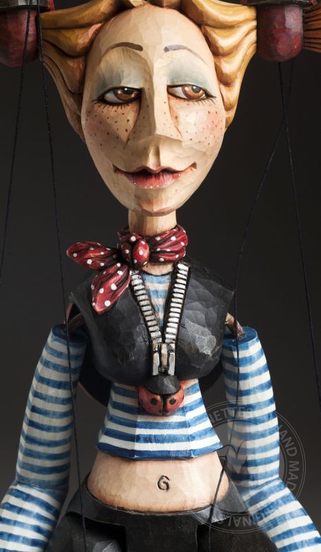 Cette merveilleuse marionnette est belle à bien des égards. Elle est ludique, joyeuse et pleine de détails incroyables. Le corps entier est sculpté à la main dans du bois, il est précisément peint à la main. La marionnette est sur un fil et dispose d'un dispositif de contrôle traditionnel. En termes de mobilité, elle a de grandes possibilités - le niveau de mouvement est semi-professionnel - il n'a pas de bras articulés (ne se plie pas au coude) mais elle marche vraiment bien. Et l'impression esthétique? Ses traits conviennent parfaitement au visage d'un esprit libre et d'élégance.