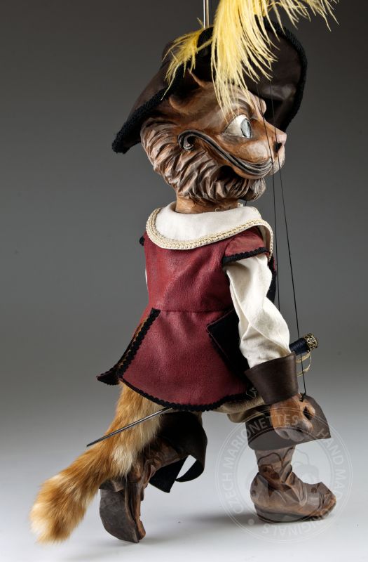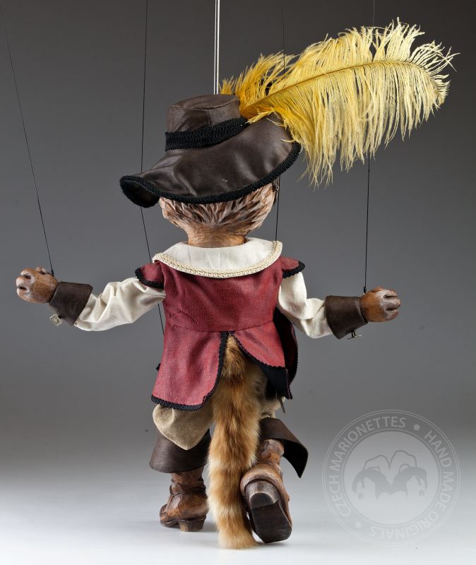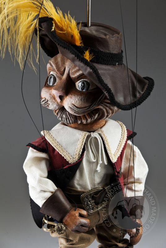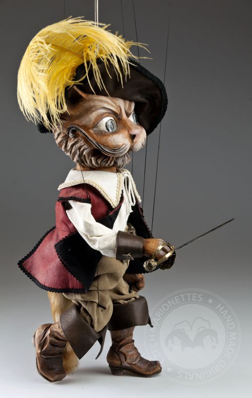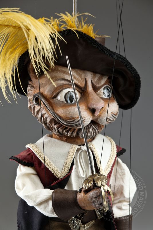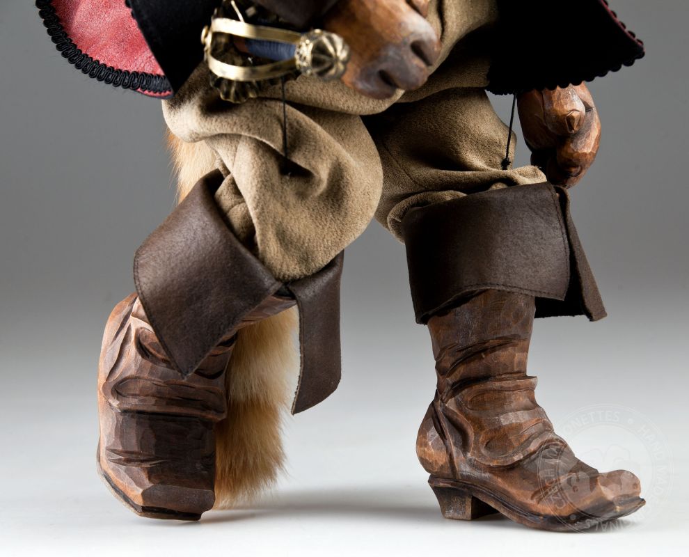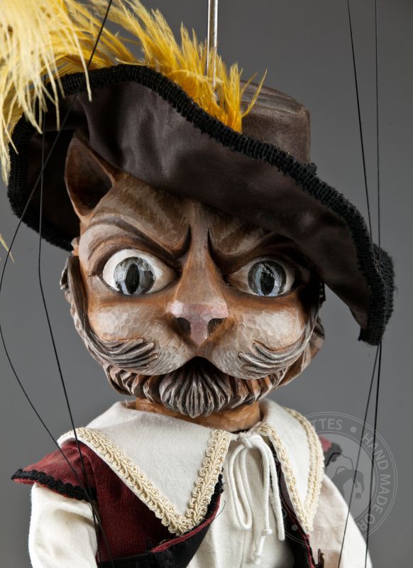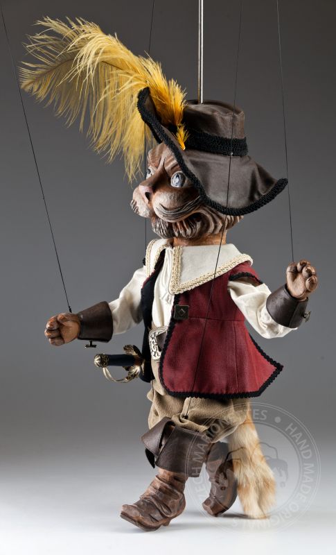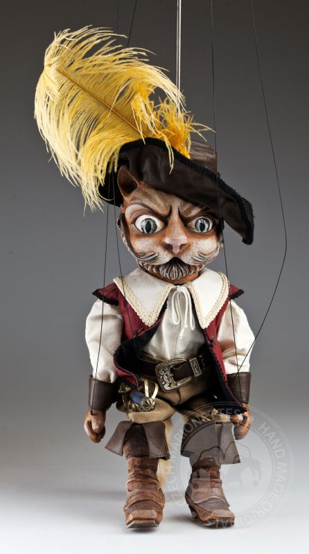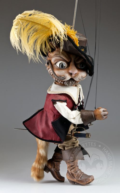 Cette marionnette en bois nous vient tout droit de l'histoire que tout le monde connaît sûrement. La texture du bois sur son corps est très expressive, tout comme les couleurs vives. La marionnette du chat botté porte une tenue incroyable qui nous rappelle les temps anciens, des chevaliers courageux et toutes sortes de monstres mystérieux.